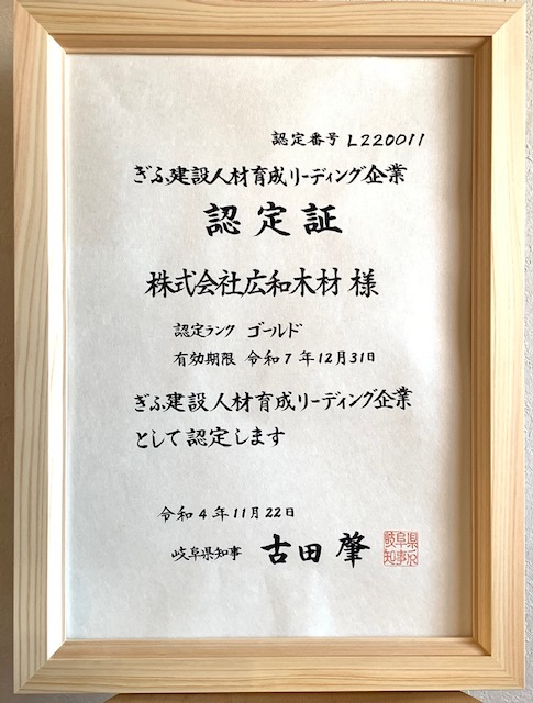 12月の【ぎふ建設人材育成リーディング企業】のゴールド企業認定について