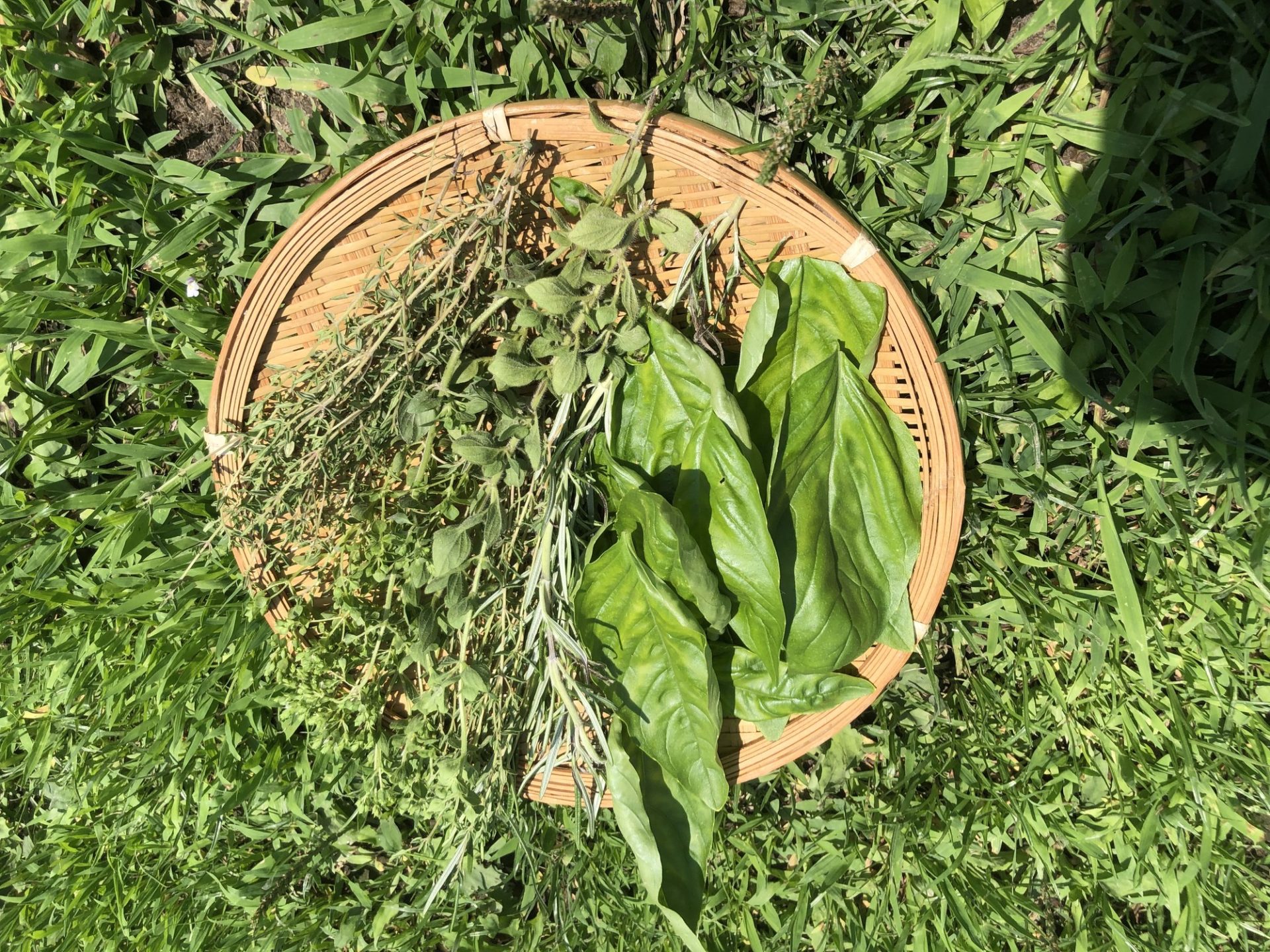 収穫したハーブは、洗ってホーローのバットの上で天日干しします。