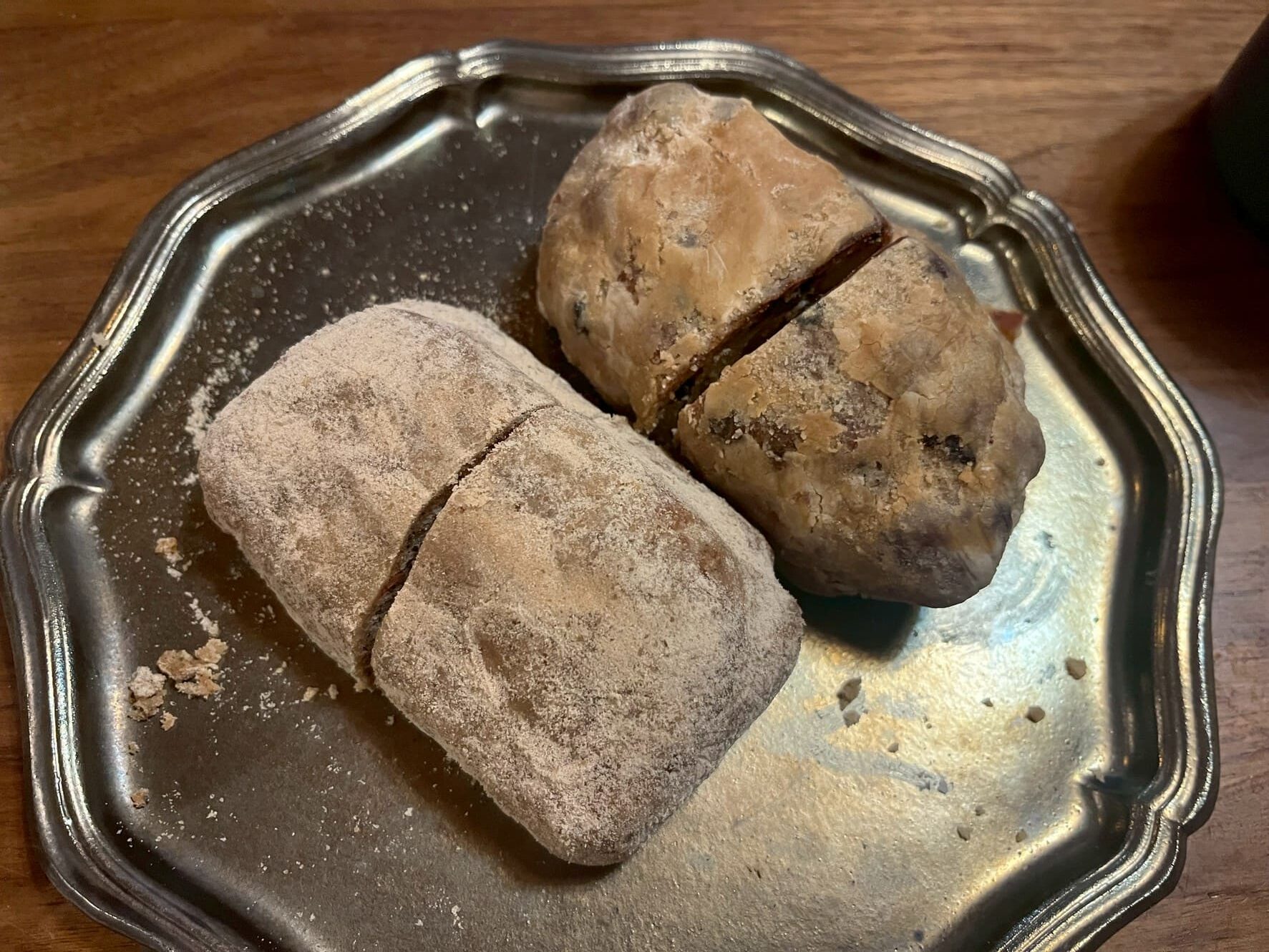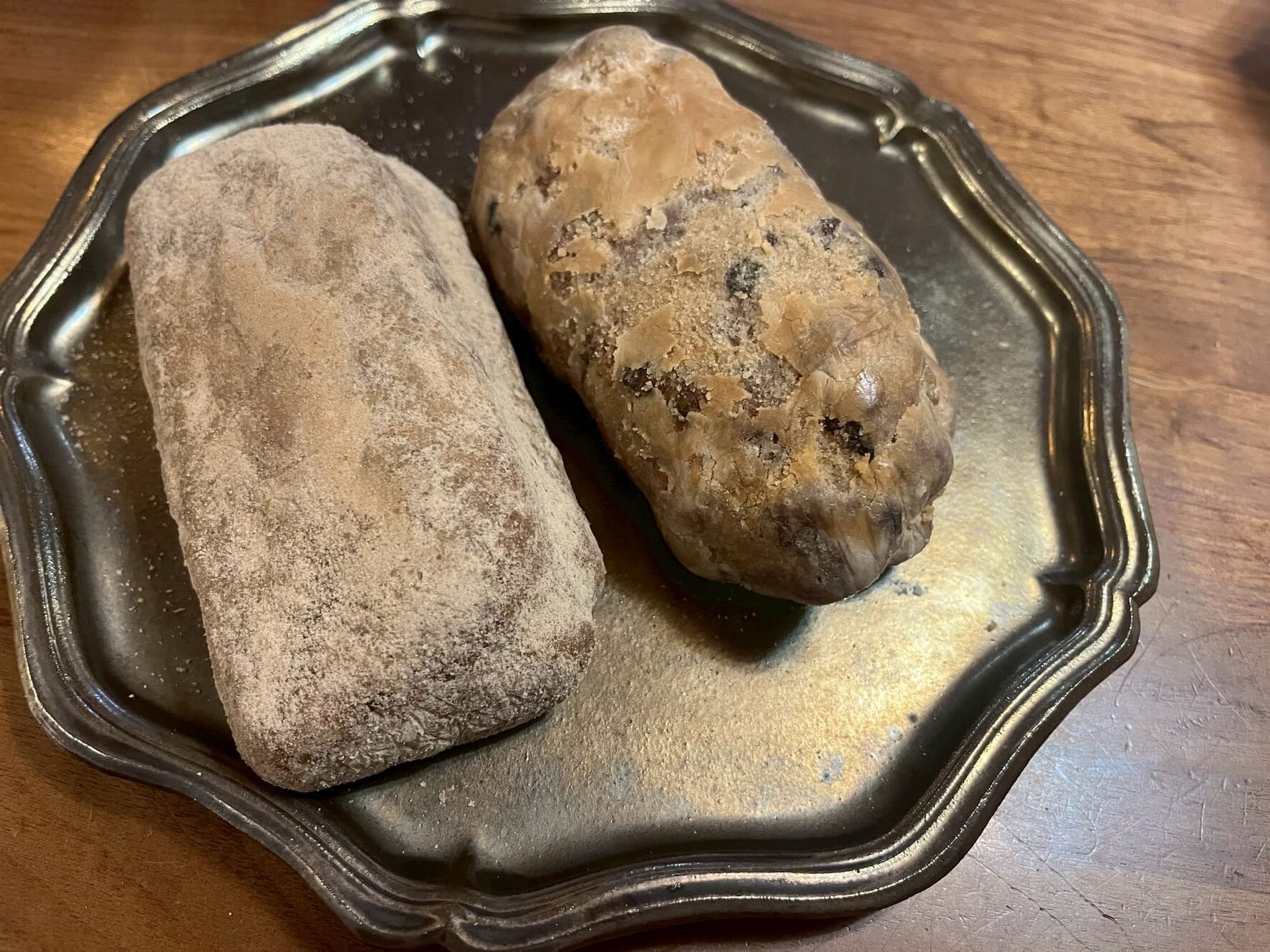 右のよりも甘くて密度がぎゅっとしているスイーツに近いシュトーレン。