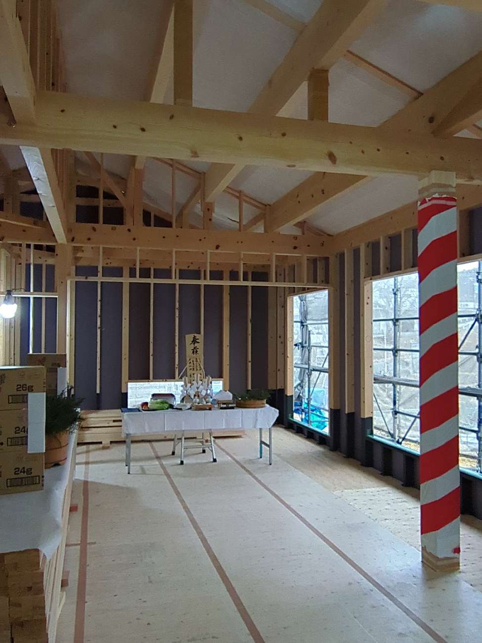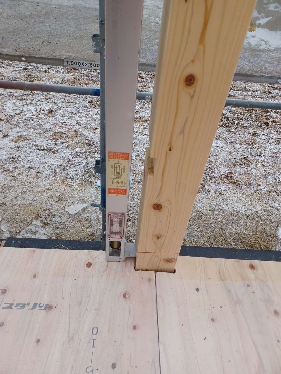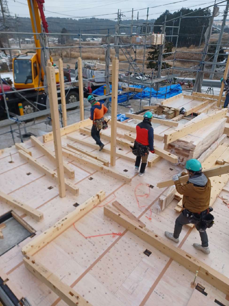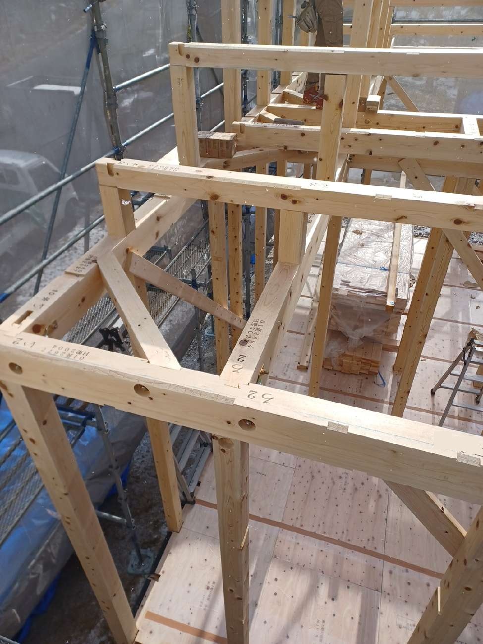 仮筋材(斜めに止めている材料)で固定して、梁・桁材を柱の上にのせていきます。