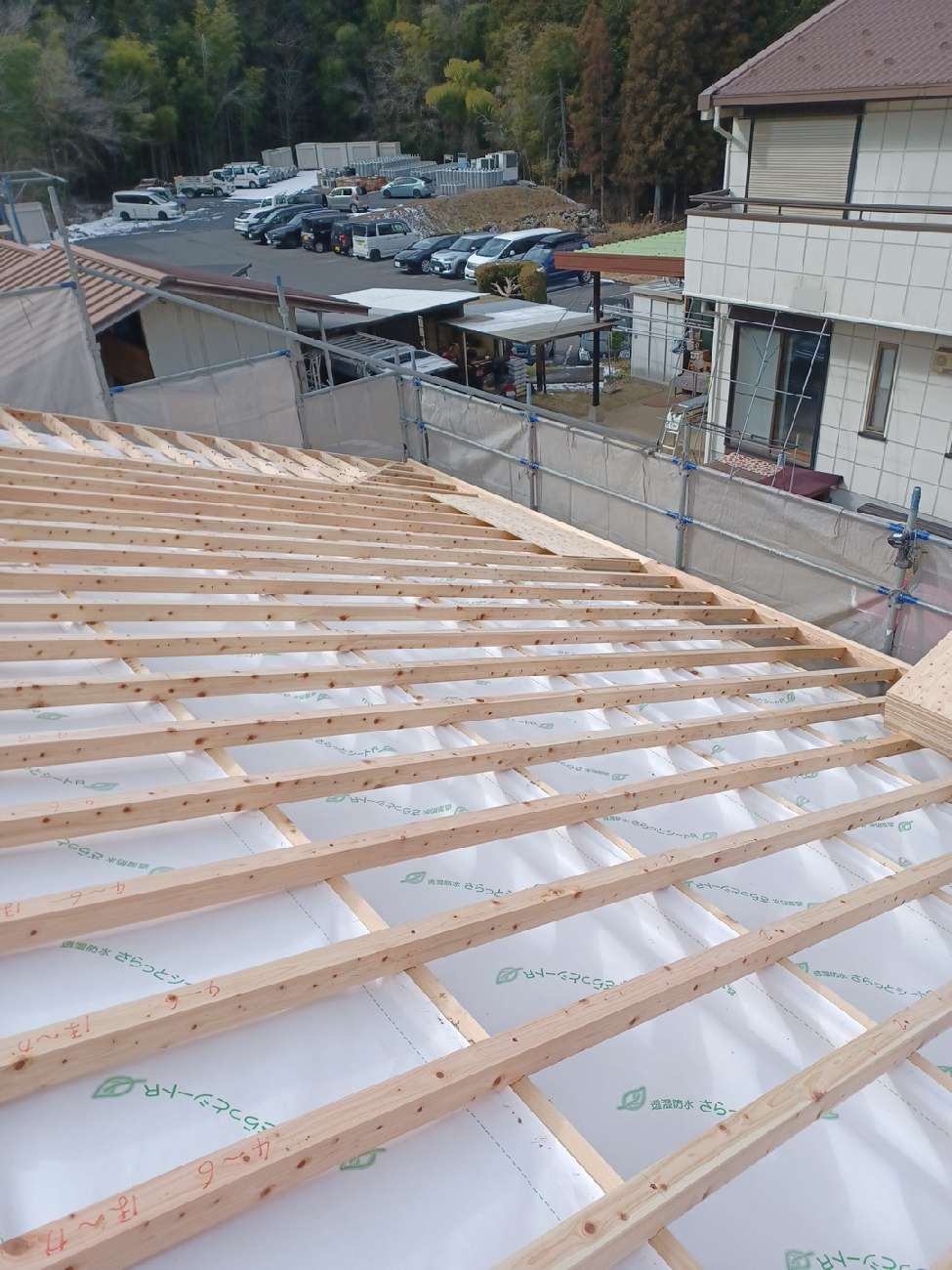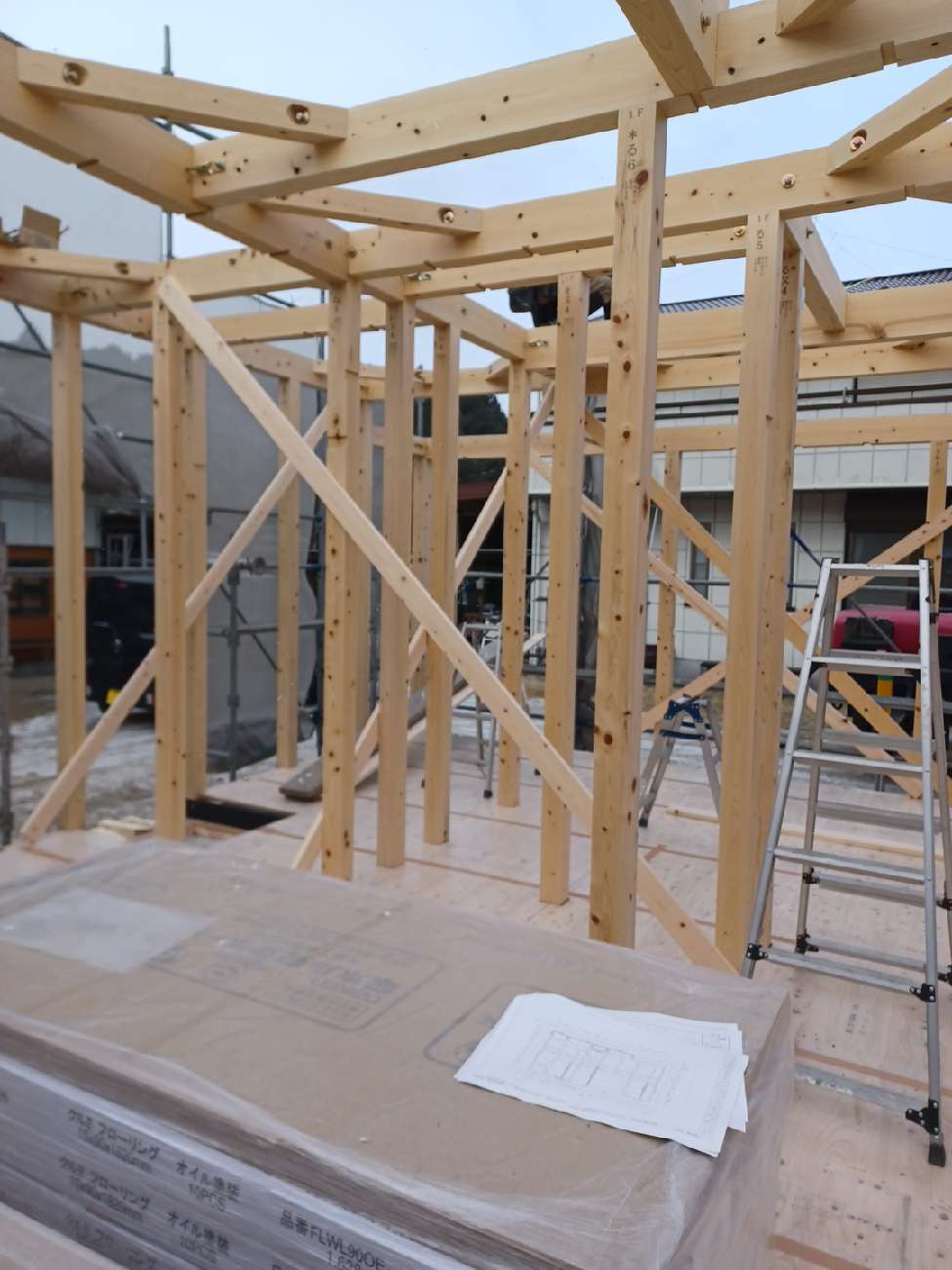 仮筋材(斜めに止めている材料)で固定して、梁・桁材を柱の上にのせていきます。