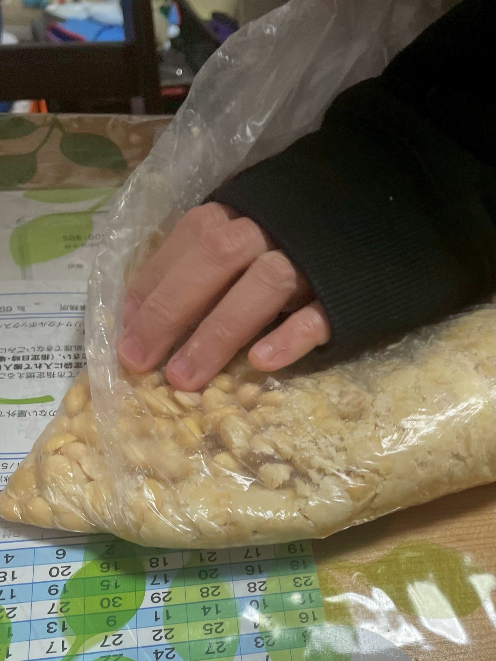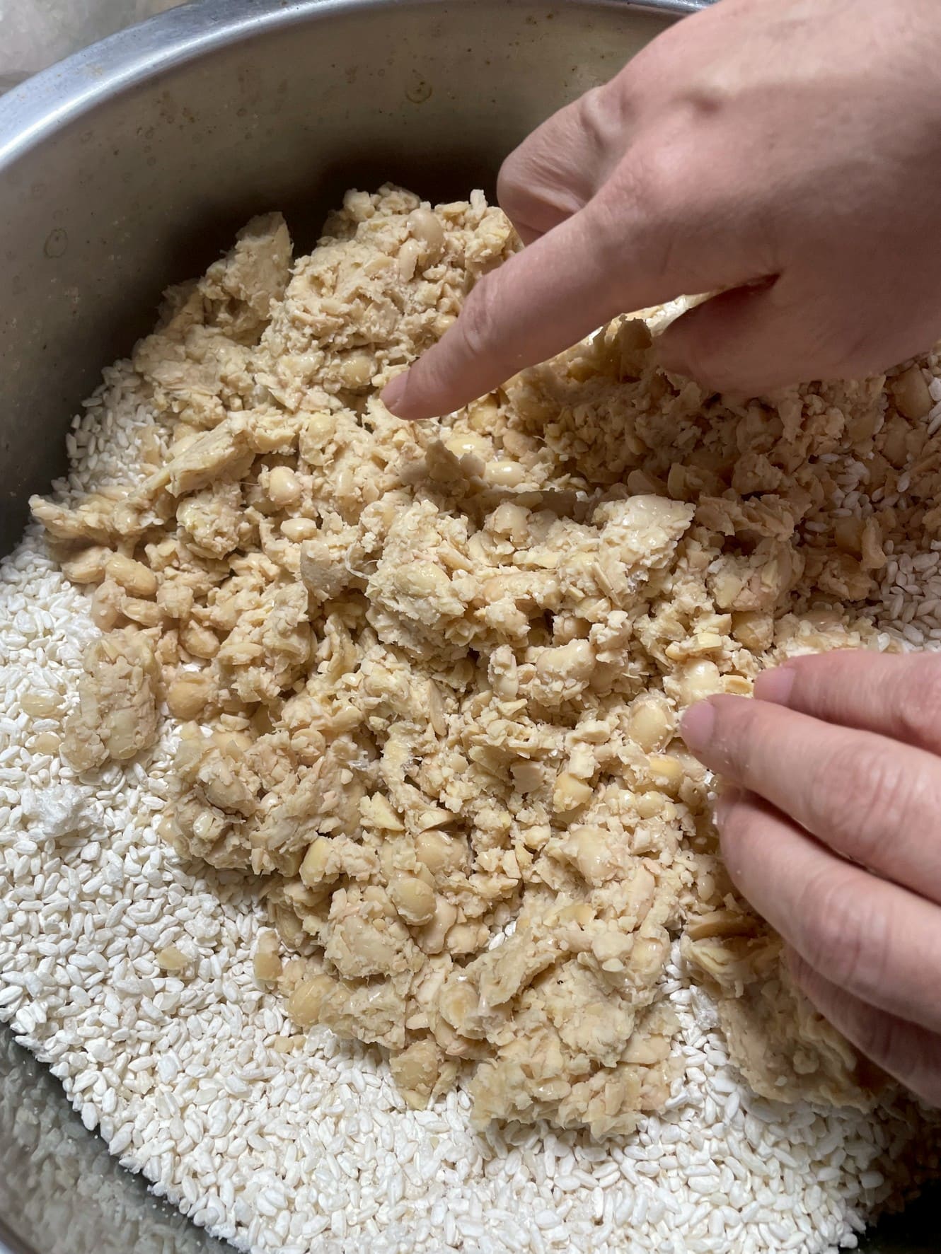 「よし、大豆も麹&塩とよく混ぜて!」と味噌マスターの指示です。