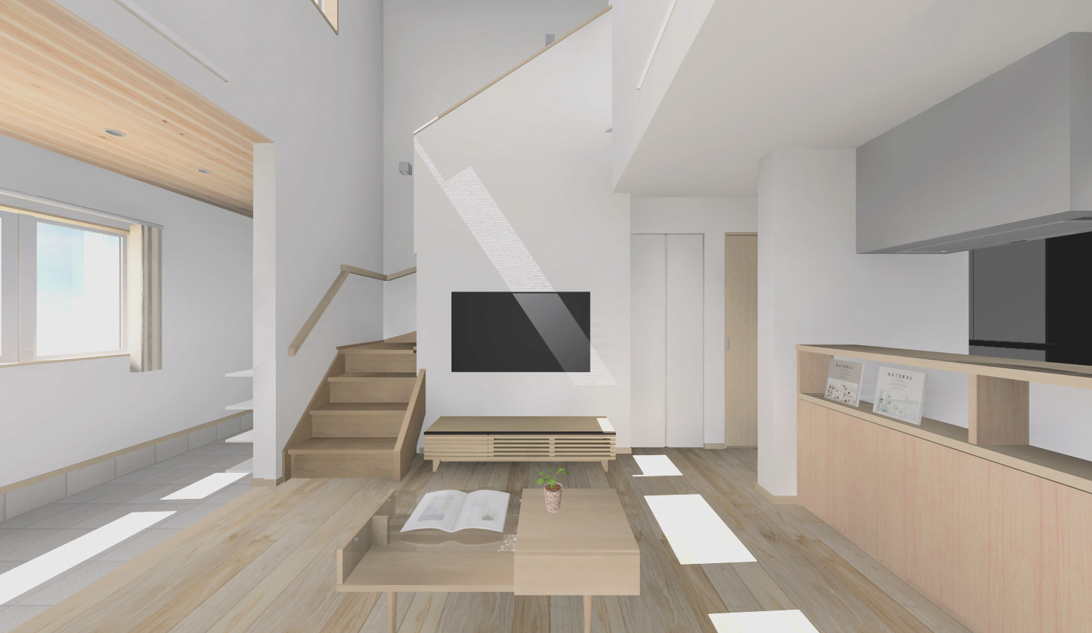 LDKに入るとすぐに、伸びやかな勾配天井のリビングが広がります。