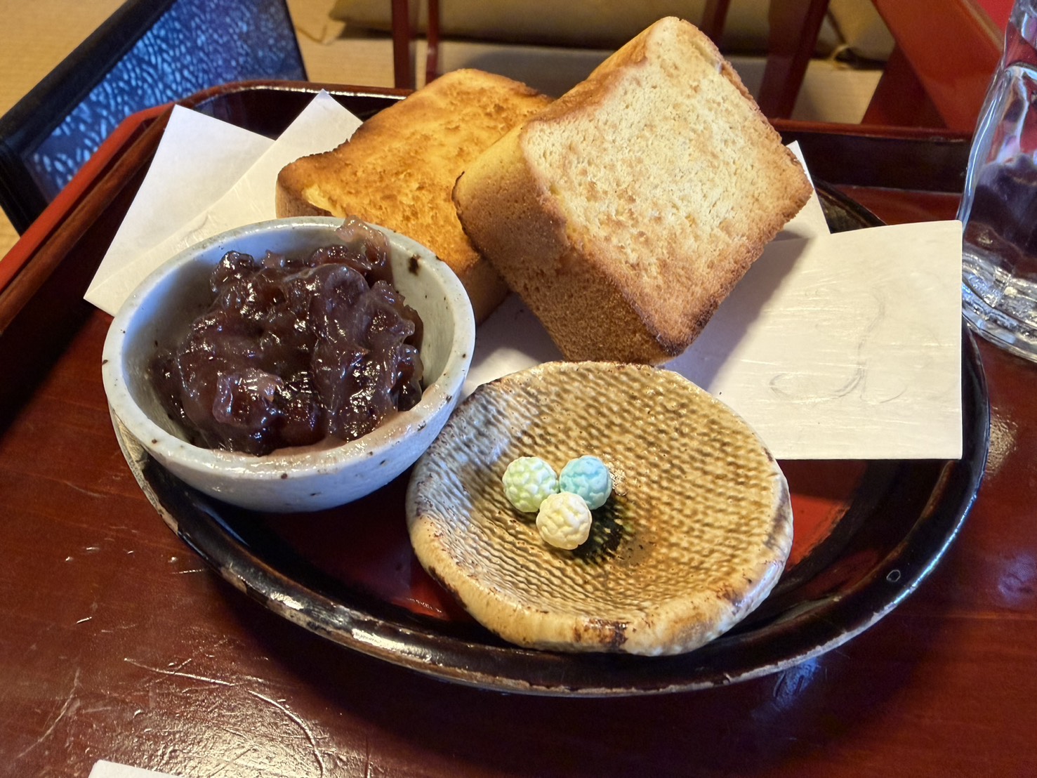 私は焼きカステラを頼んだのですが、粒あんと一緒に食べるのが