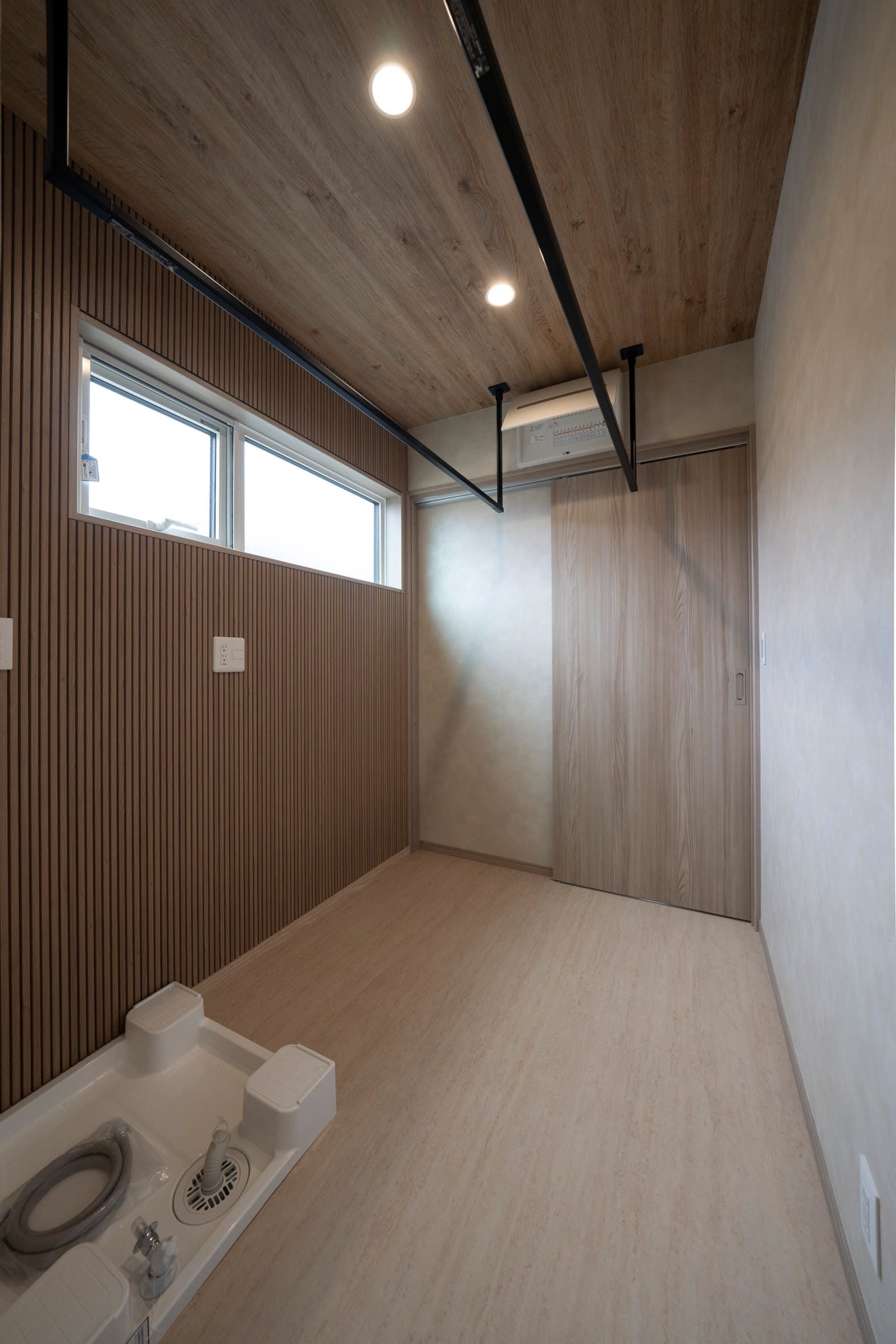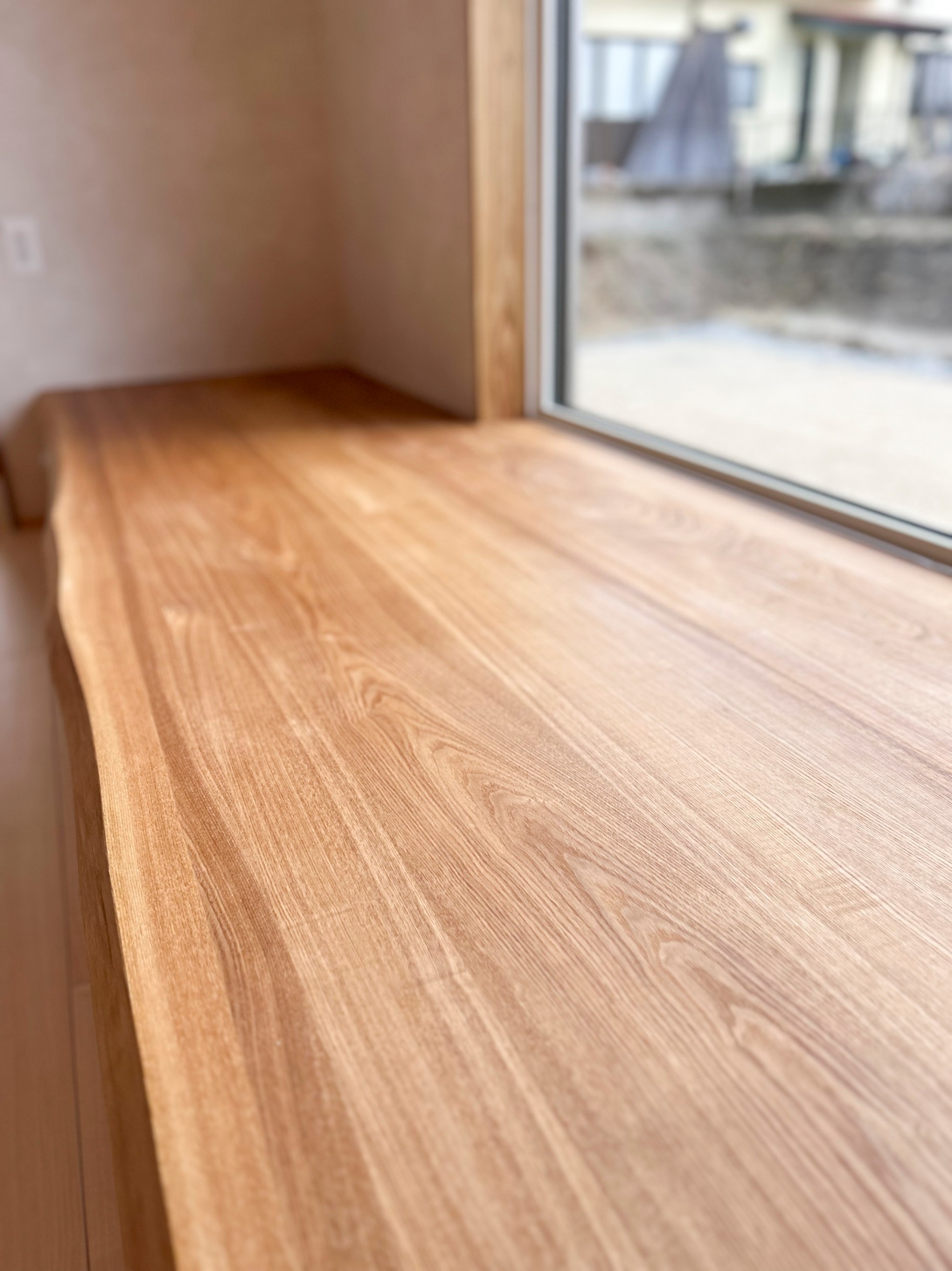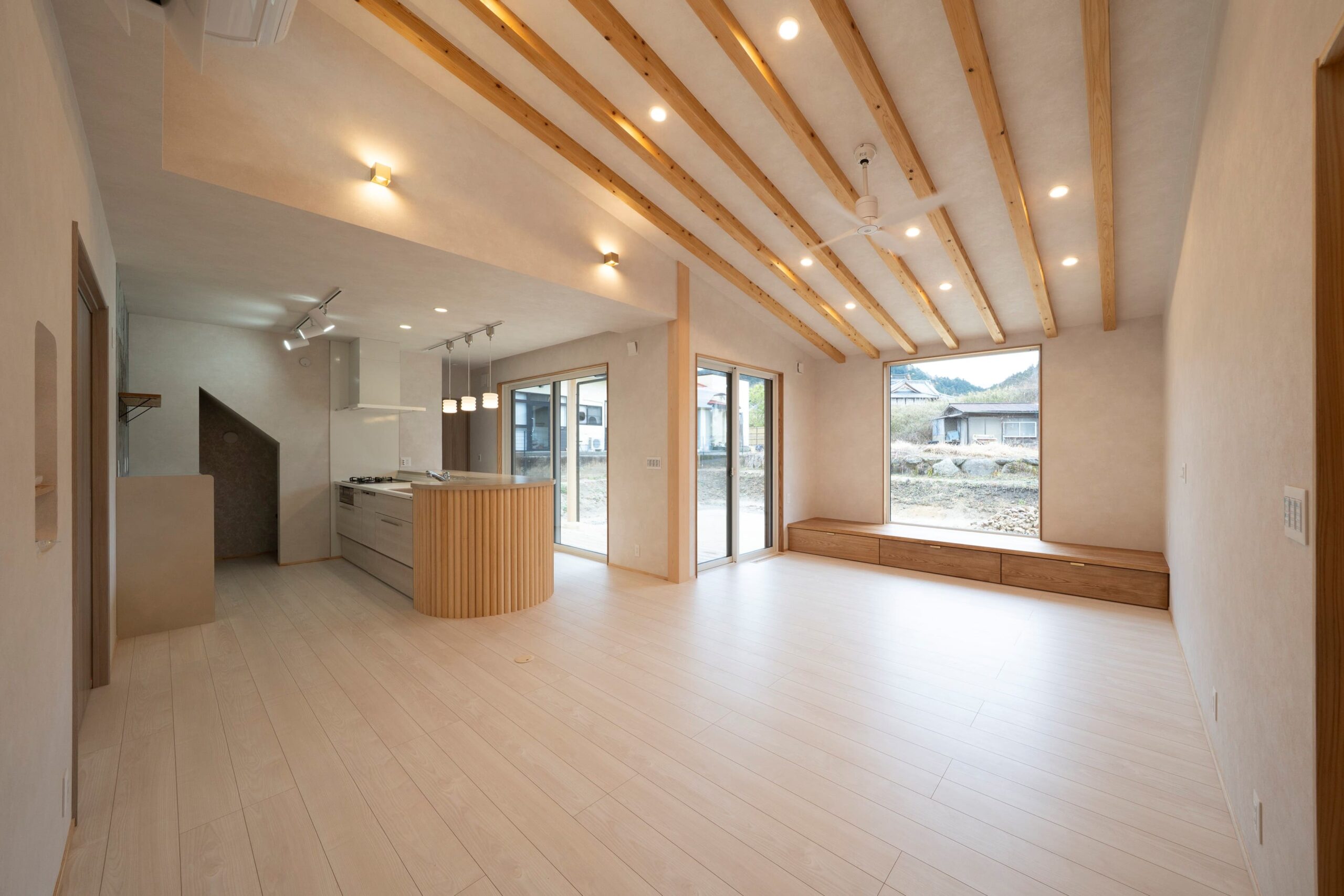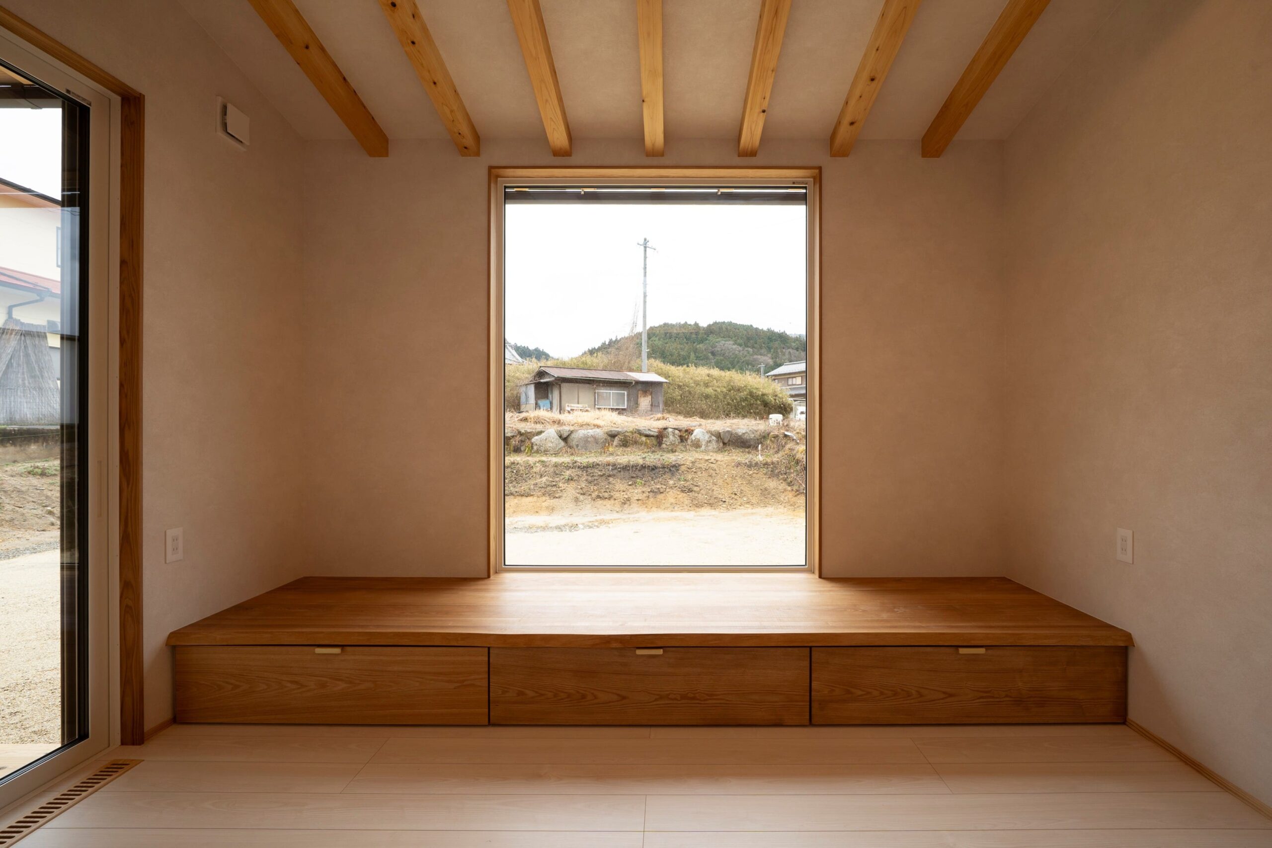 当社特有の材木を生かして、タモ材の窓ベンチや桧大黒柱。サッシ枠は杉材。