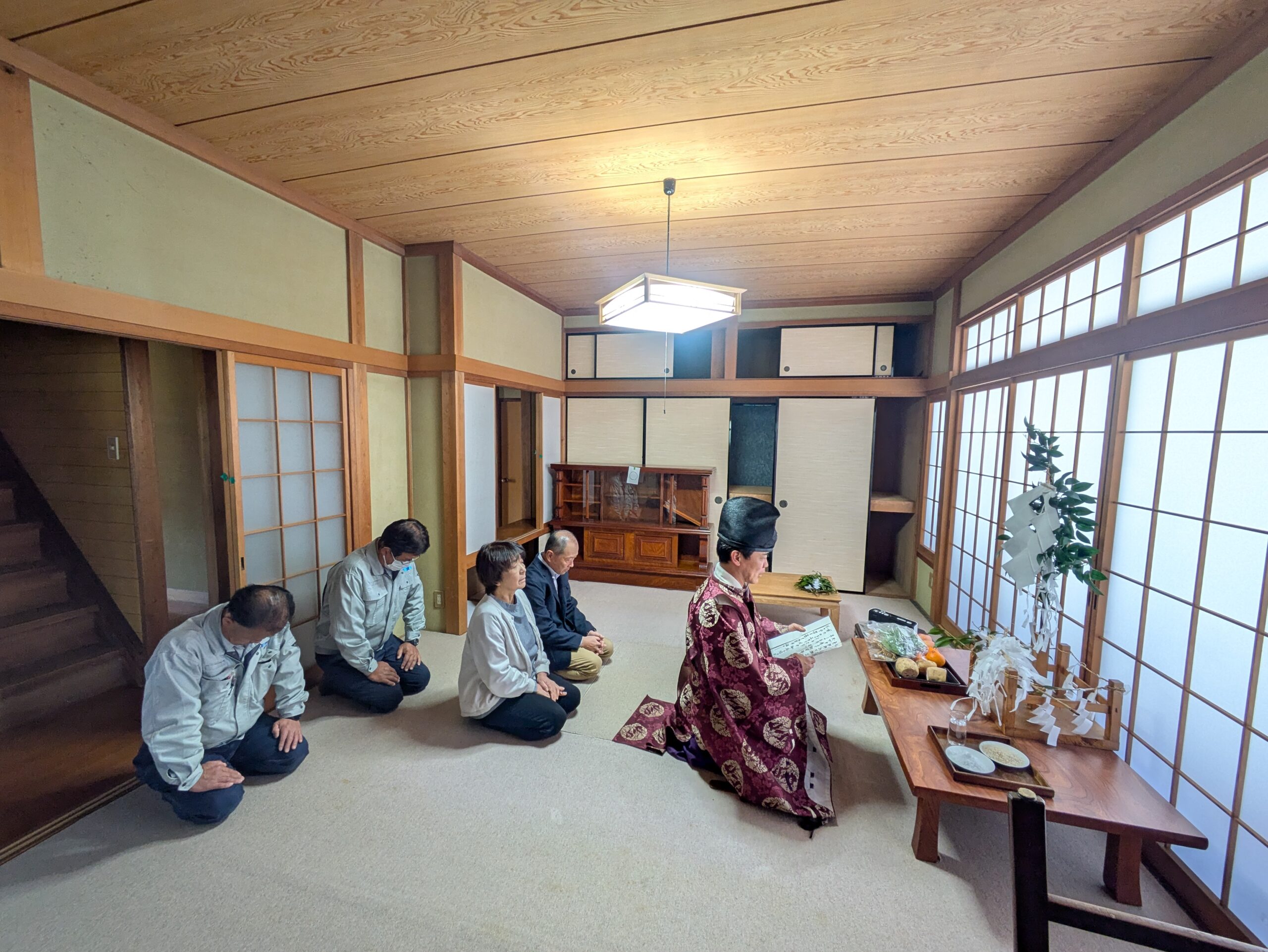 建物の神様に工事の報告し、敷地を清め、神様に感謝しこの建物を鎮めて貰い
