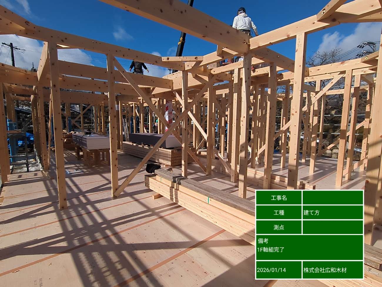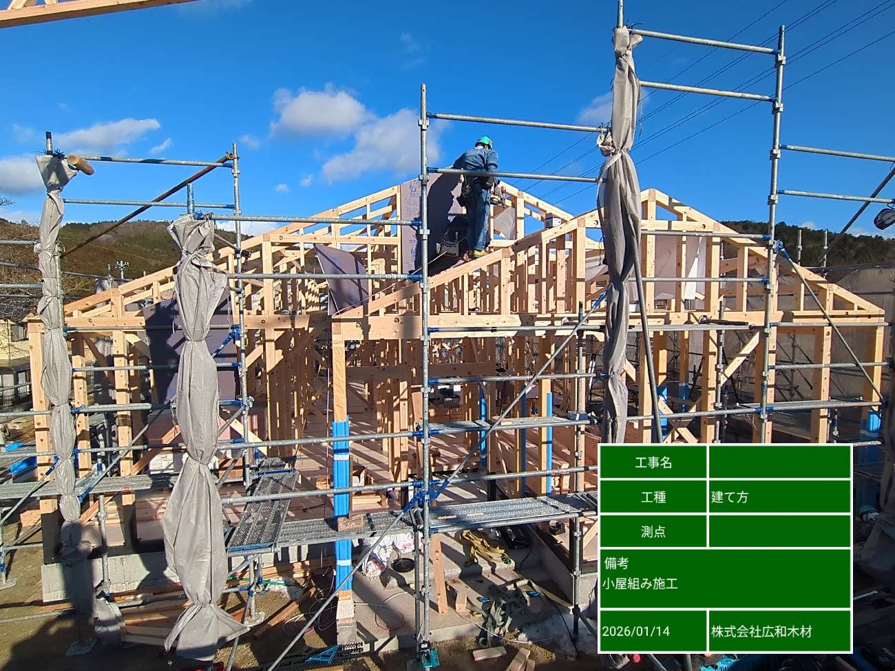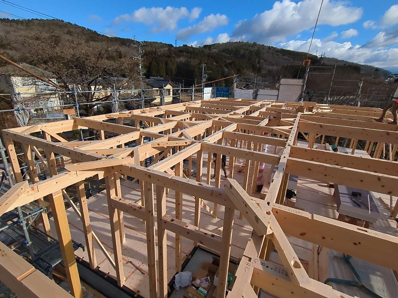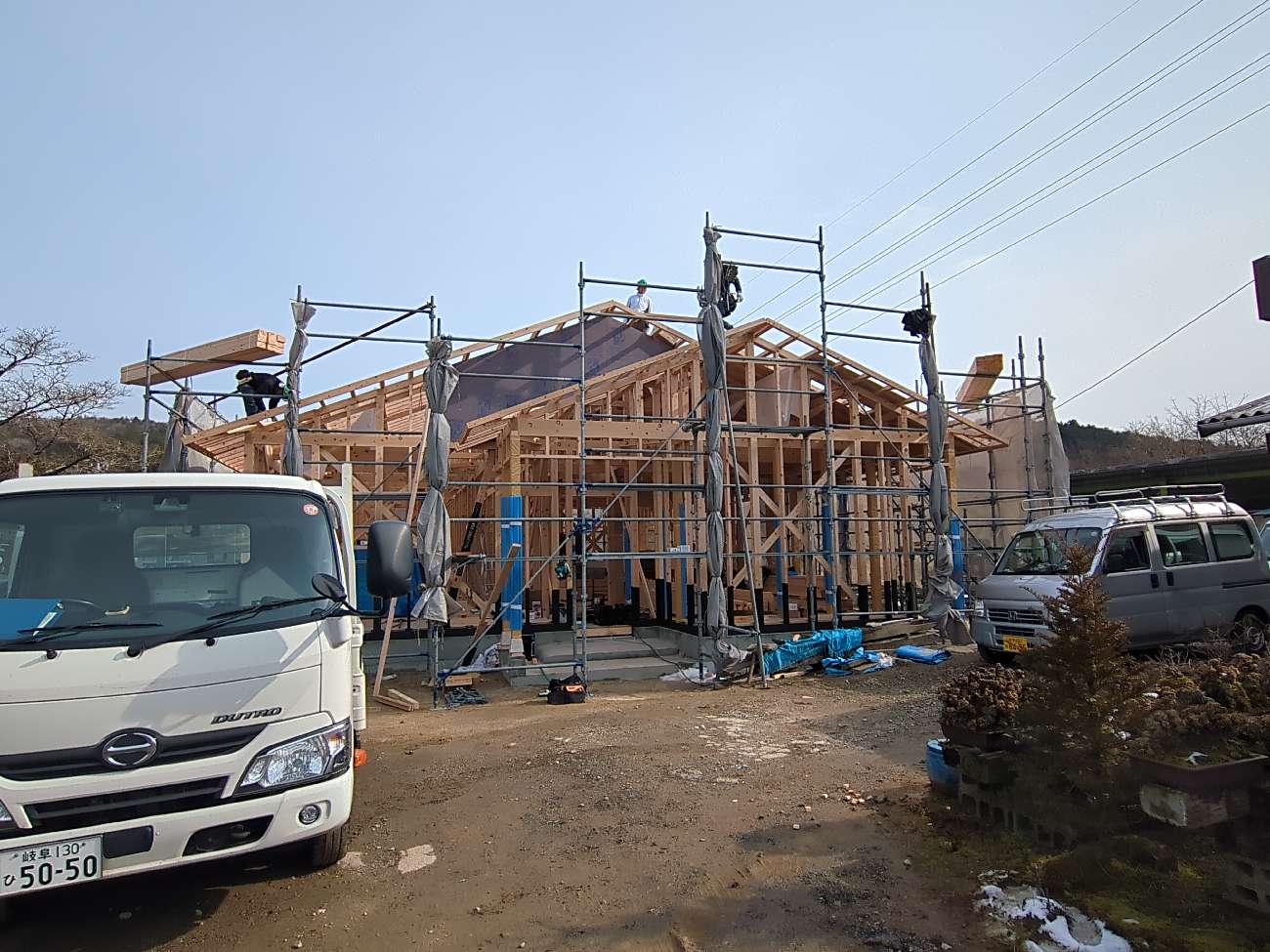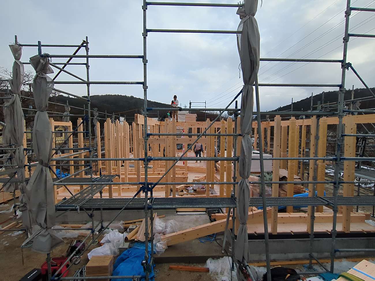 2日目は霜が降りていたので羽柄の施工や耐震金物の設置を優先に作業開始!