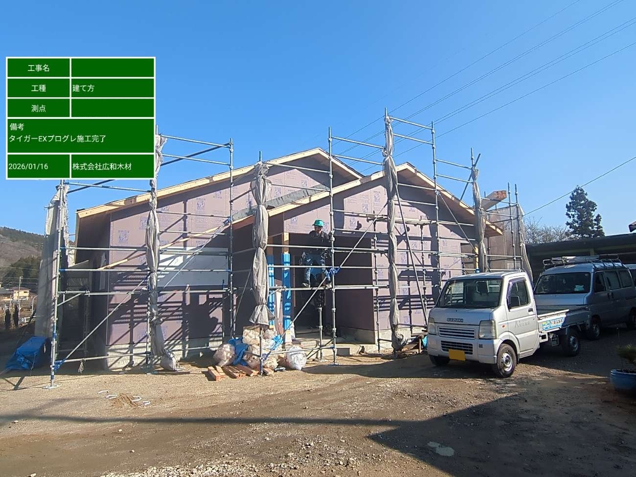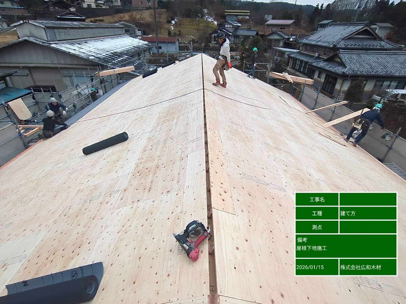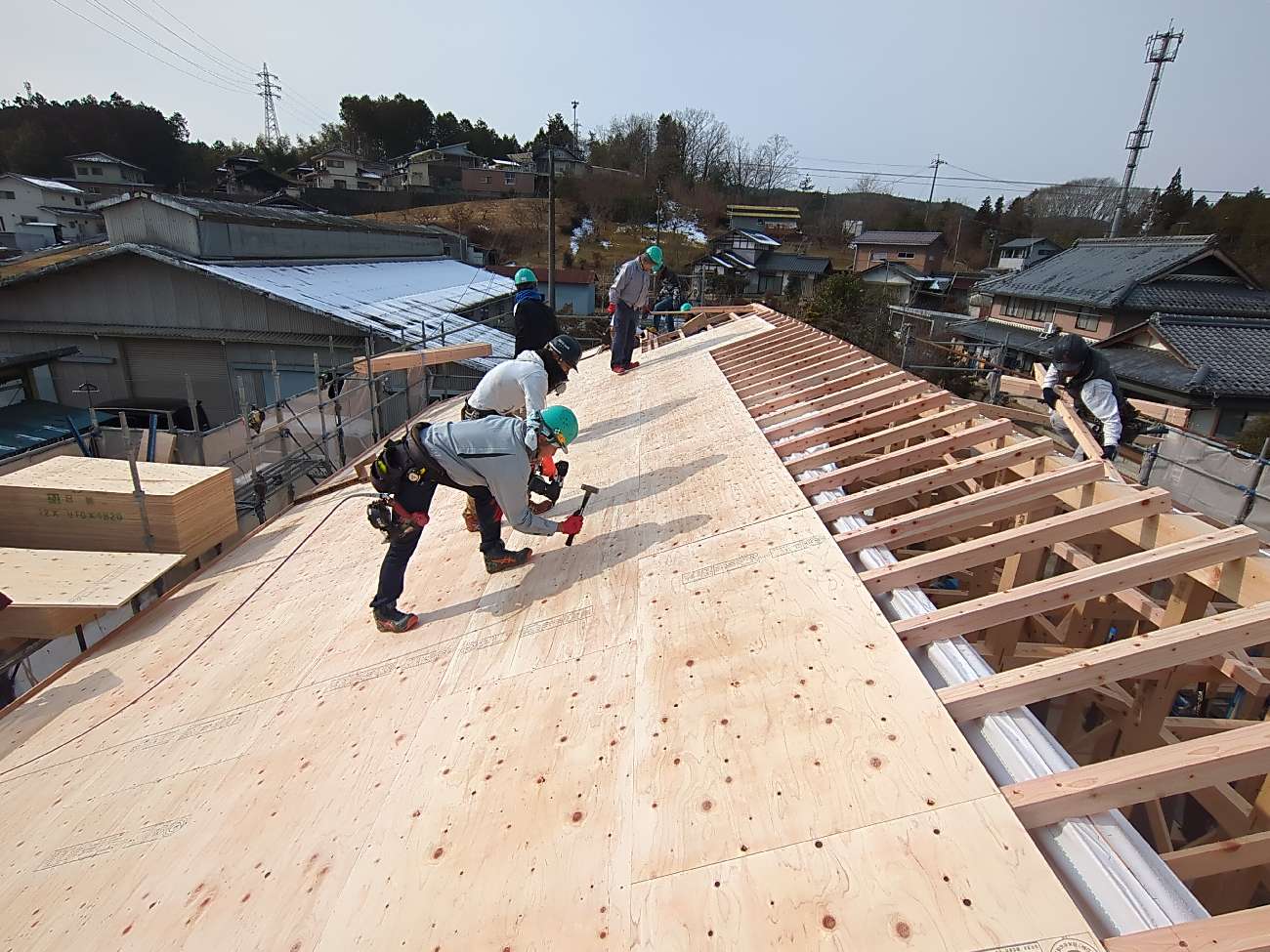屋根下地の完成、耐力壁の施工まで完工し2日目終了!