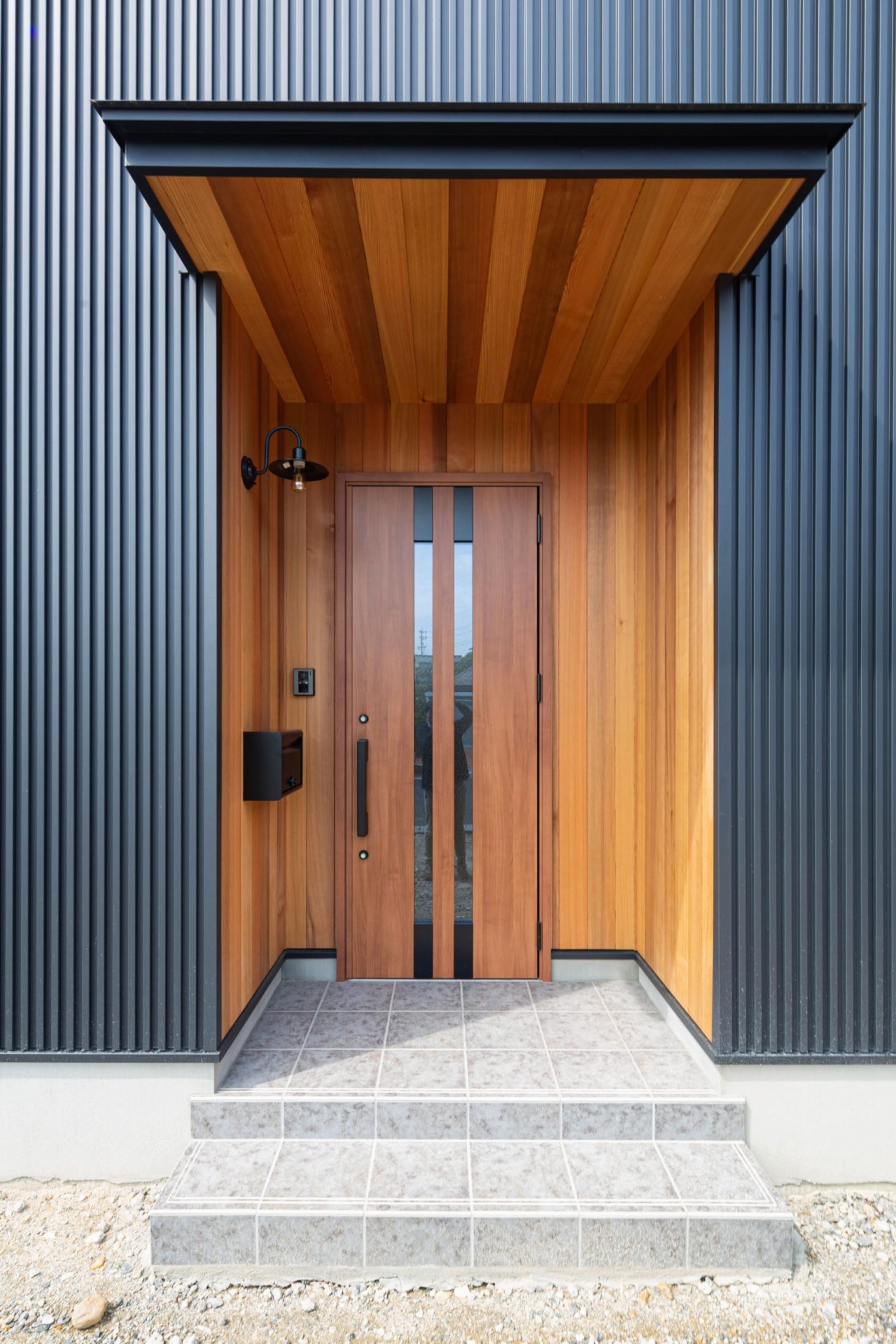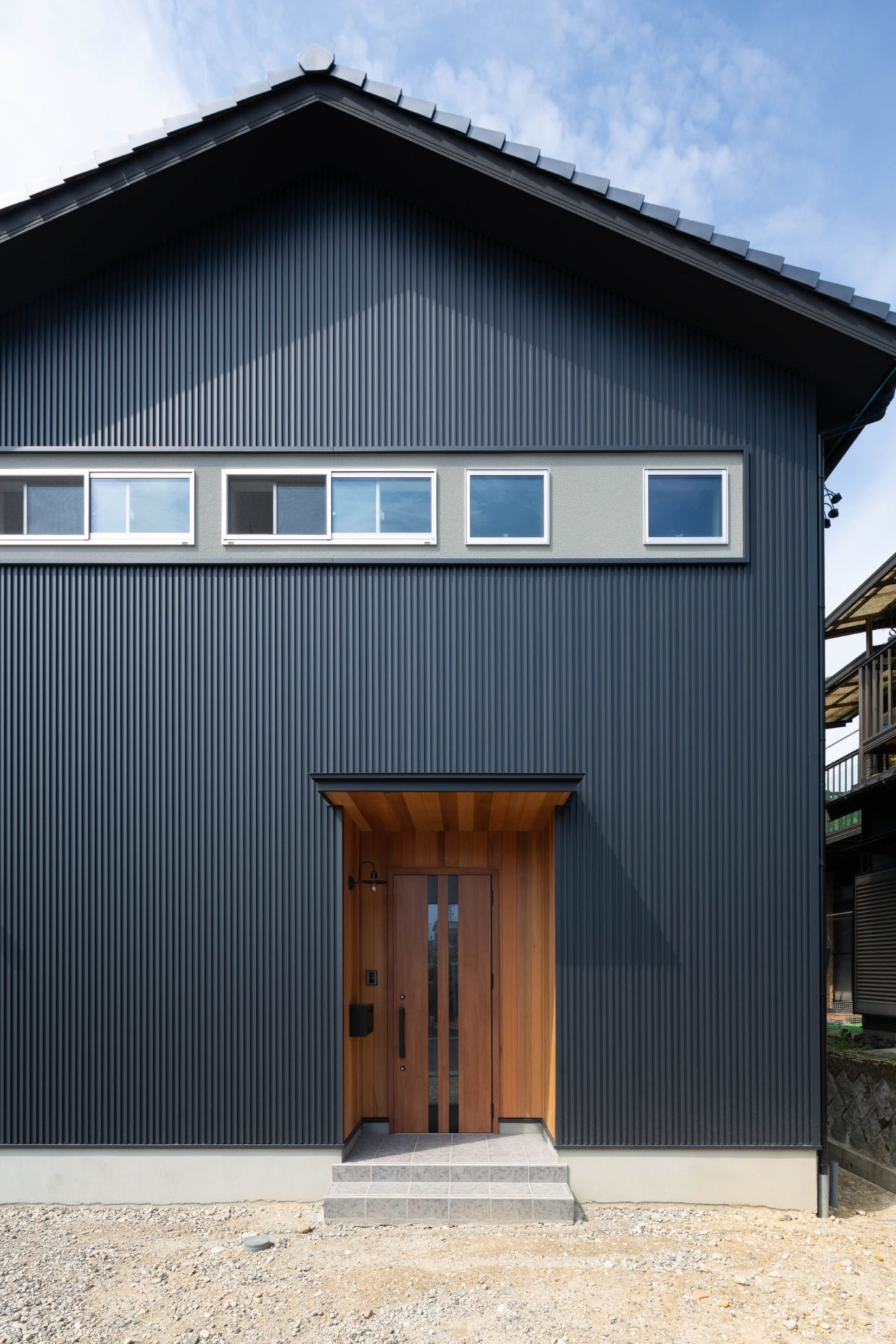 外観は、ブラック色のガルバリウムKスパンをメインで、アクセントに