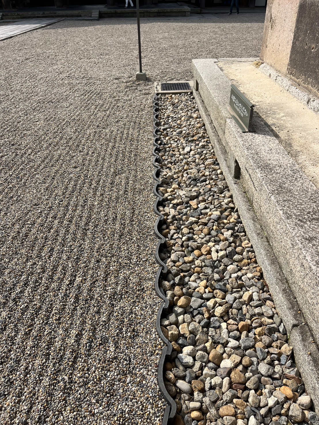 金堂の犬走廻りに、雨水がたまらないように川砂利と砂が瓦で仕切ってありました。