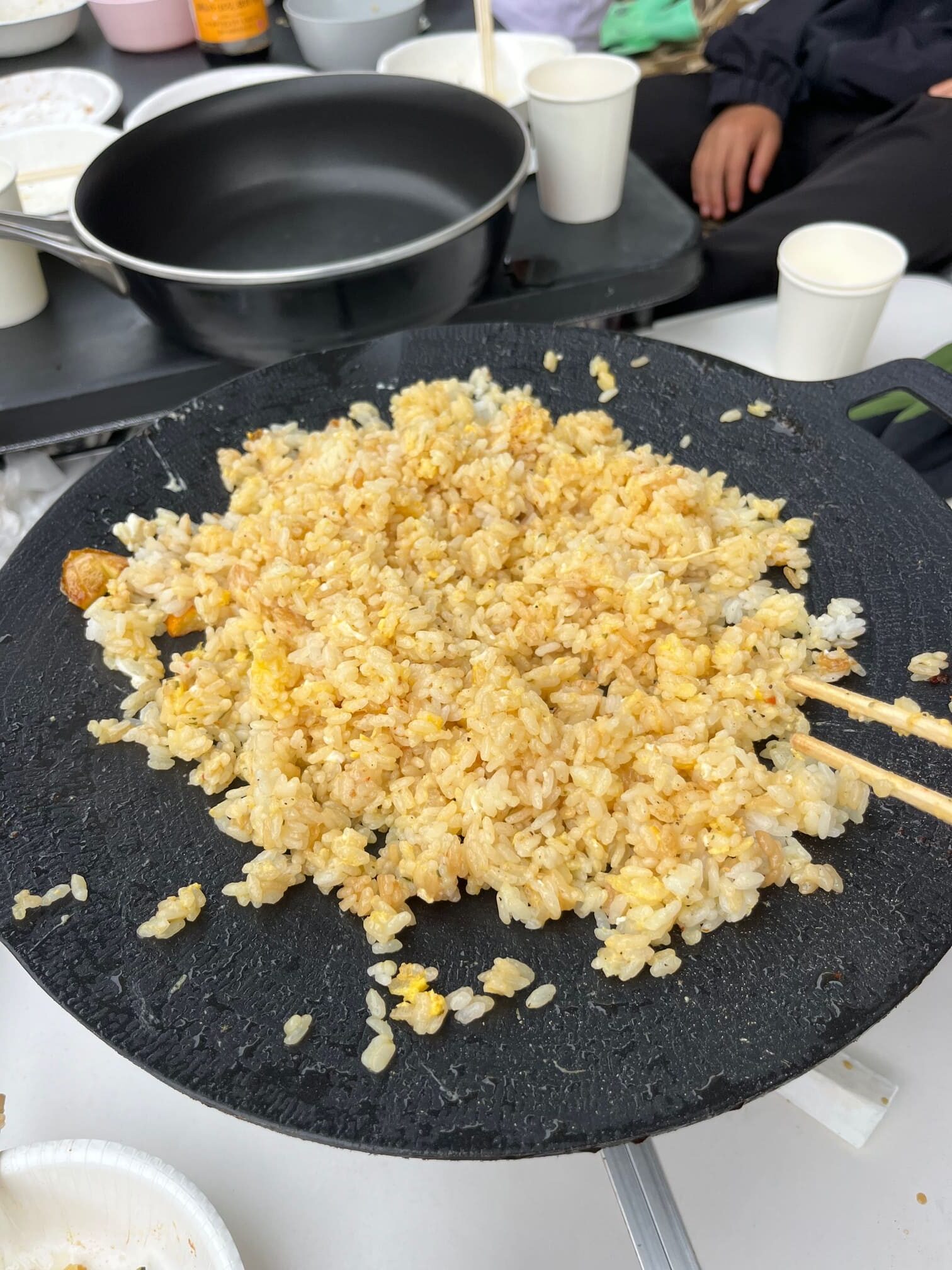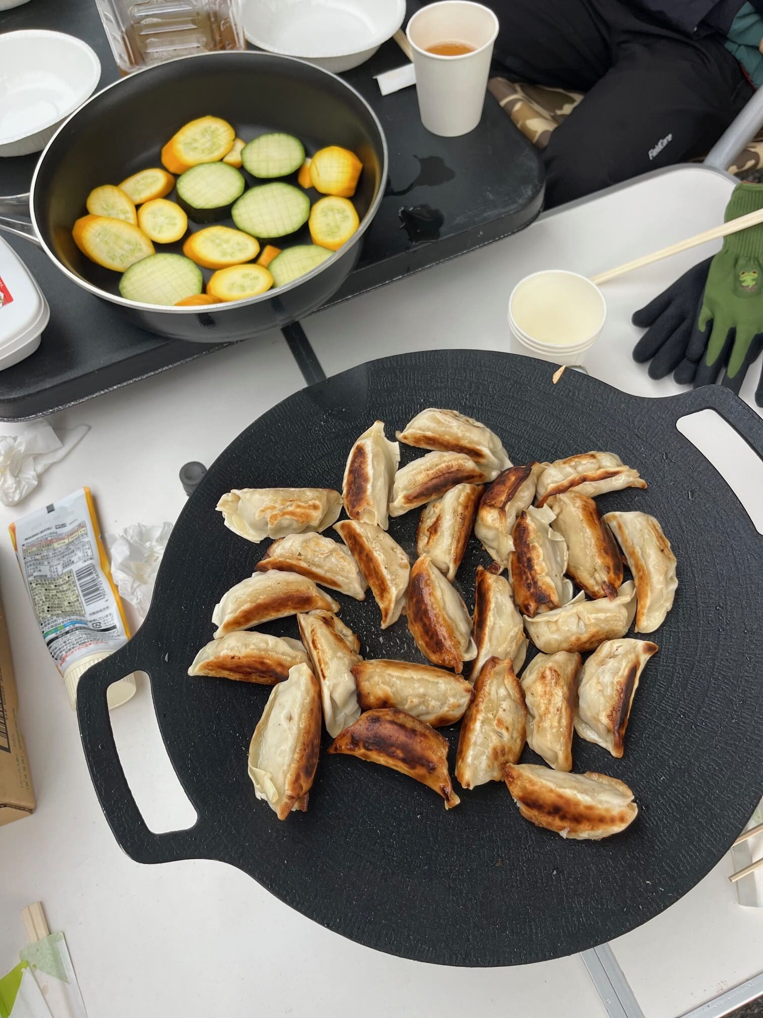 家でとれたズッキーニと餃子を焼き、卵チャーハンを作って食べました♪