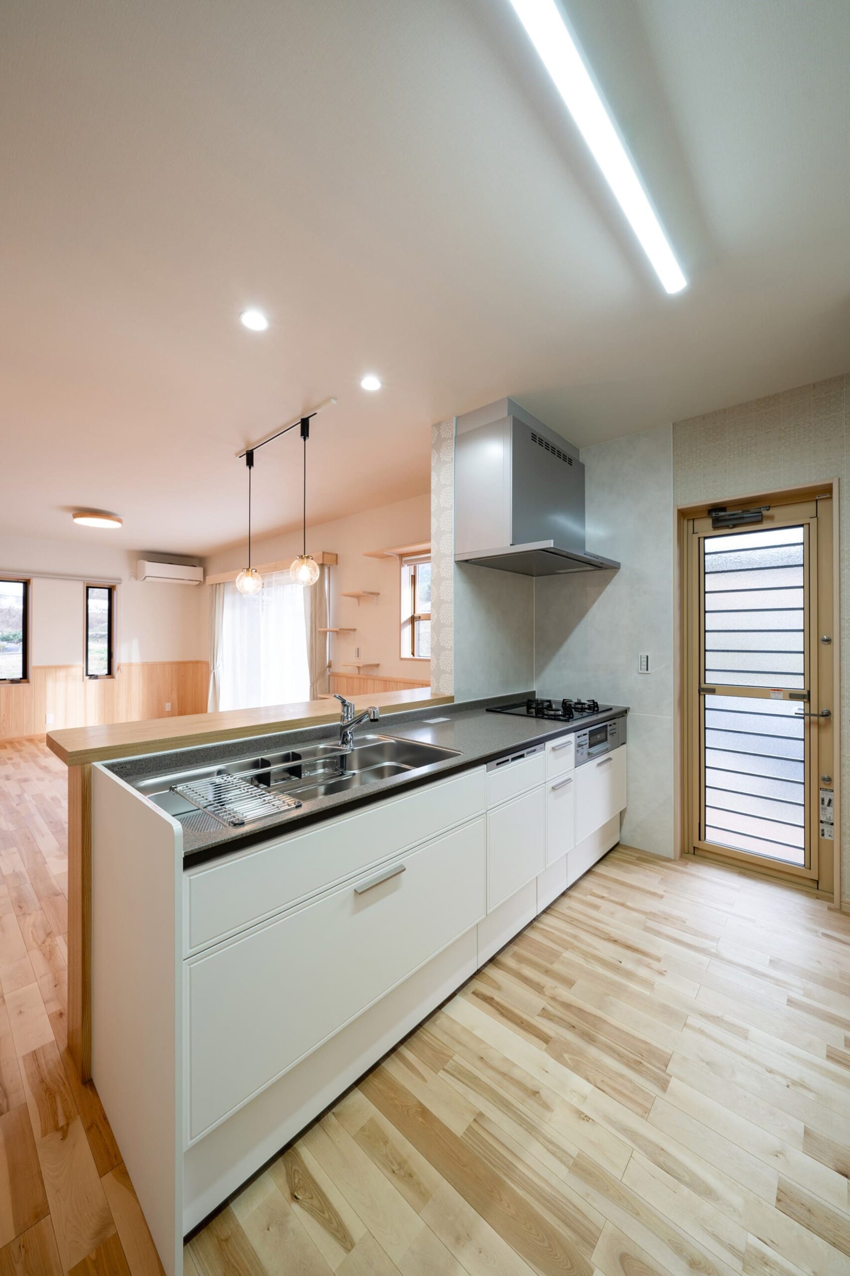 床材はバーチ、腰板は桧、キッチンカウンターはタモを、