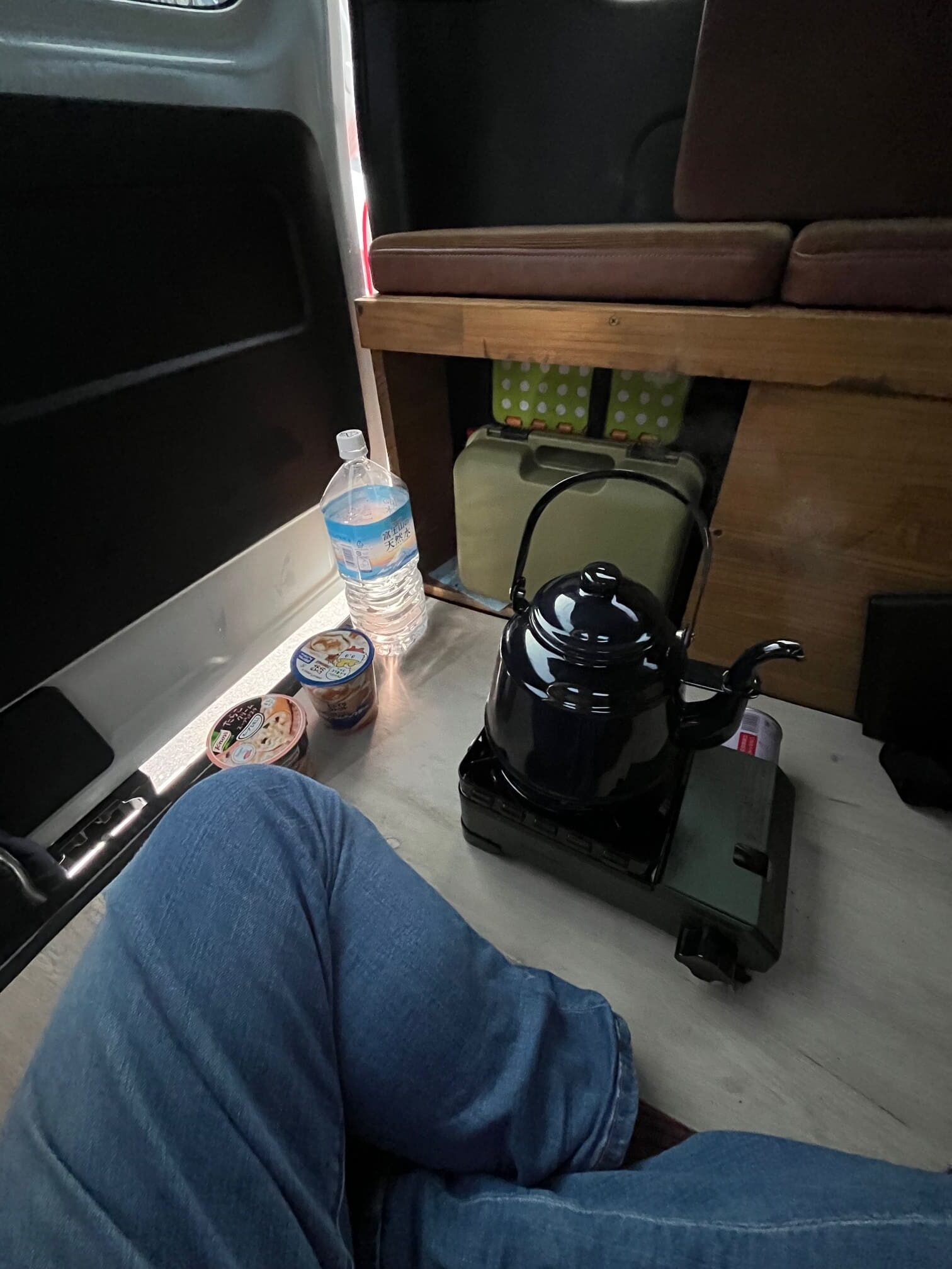 車内でお湯を沸かしながらスープとパンで朝食♩