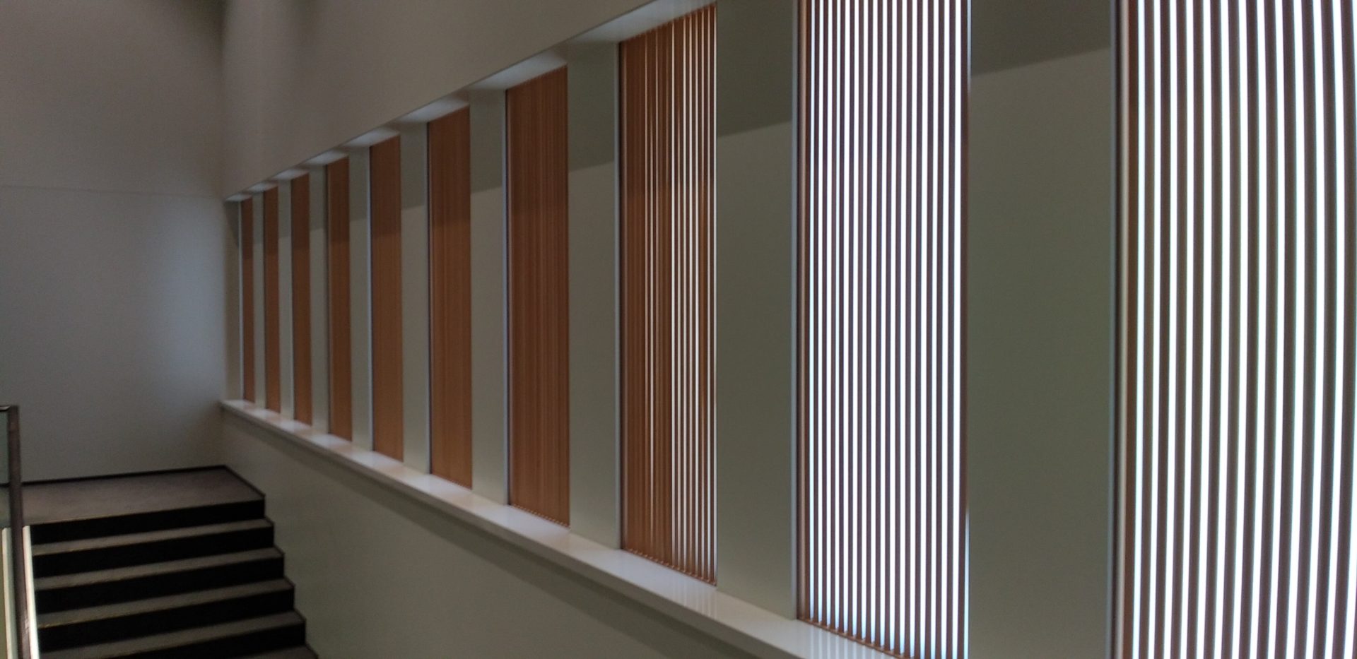 杉本博司氏デザインの、木曽檜の角材を、45度回転させ配置した格子です。