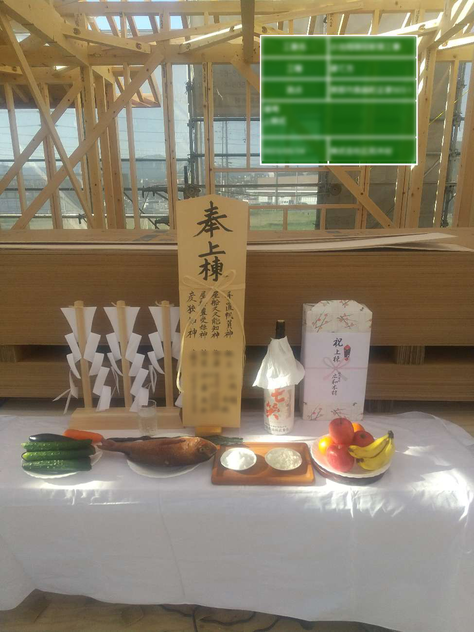 初日は雨予報で次の日は晴れ予報でしたので、建て始め上棟式に変更しました。