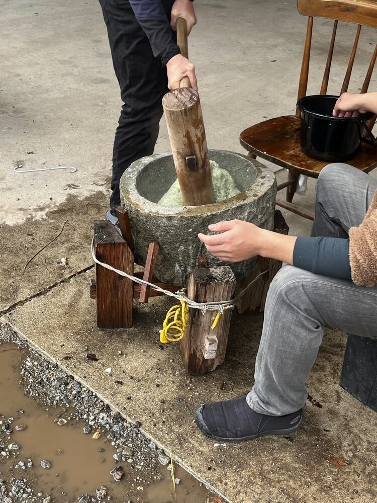餅つきは、機械でつくのではなく、本格的な杵と臼を使用します。