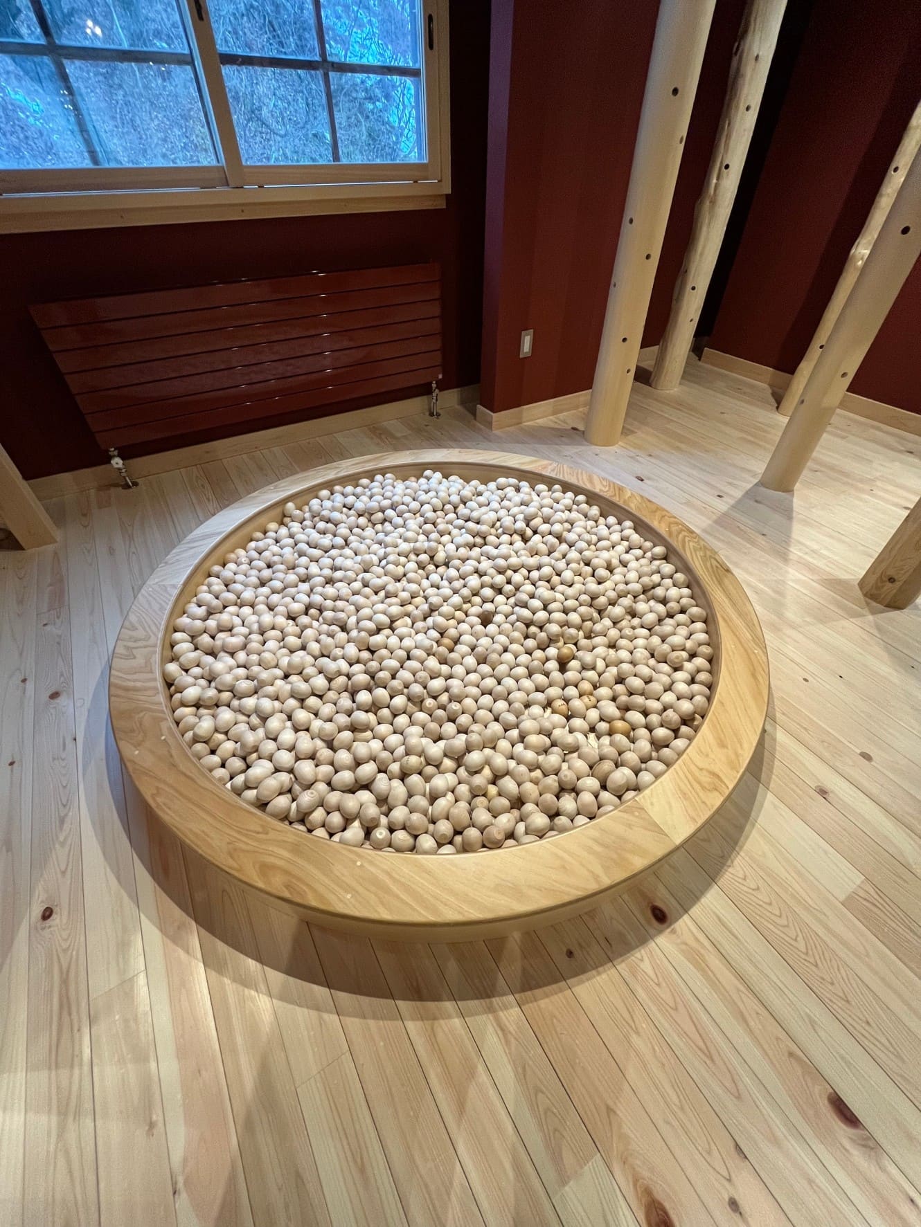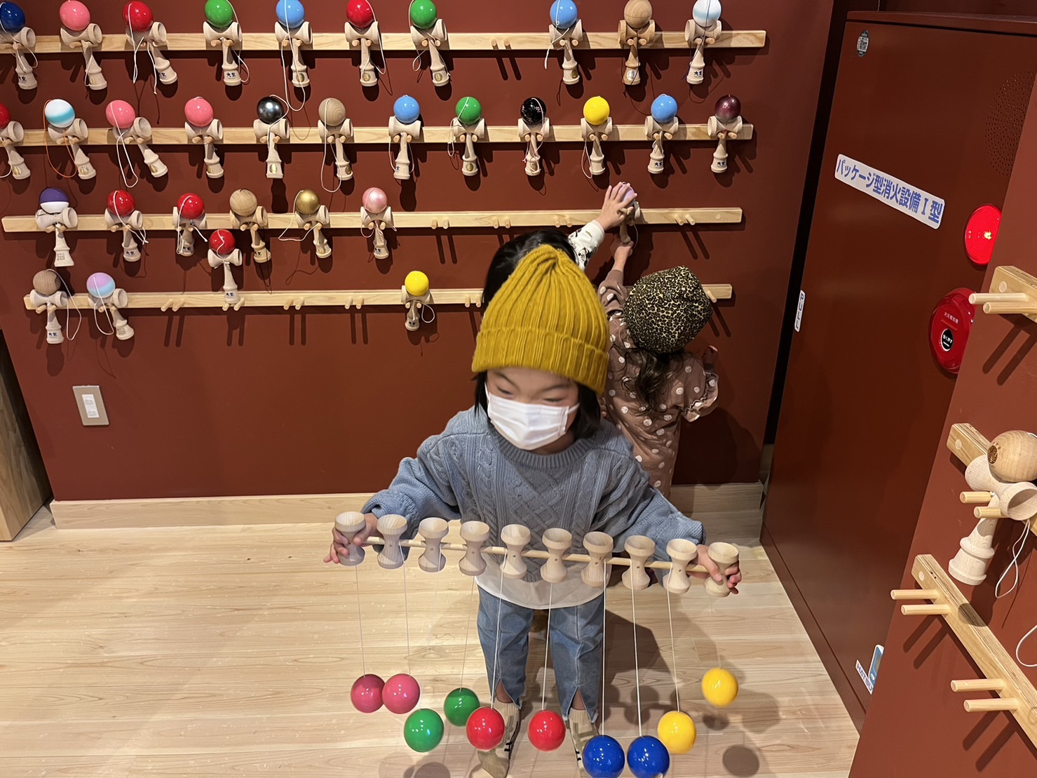 入り口周辺には、木の卵プールやけん玉木の積み木などたくさん!