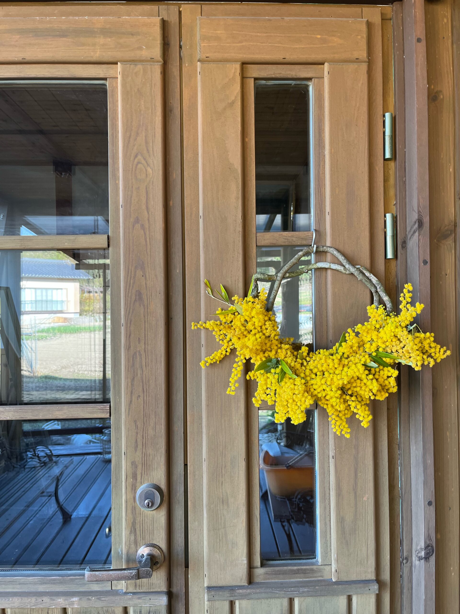 今年はおすそ分けしたミモザがリースになって帰ってきました。