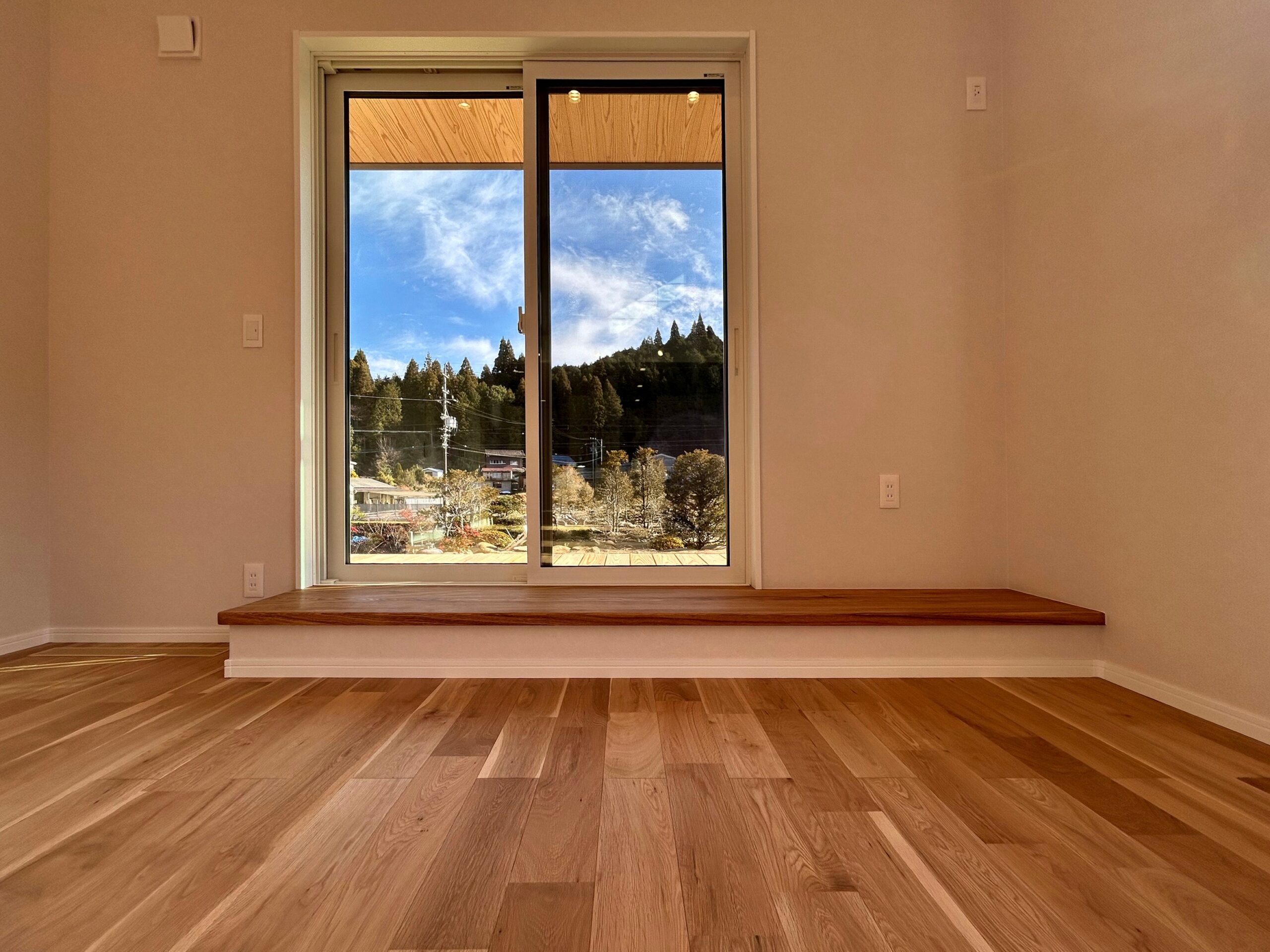 中の窓ベンチからウッドデッキに出ることができますし、