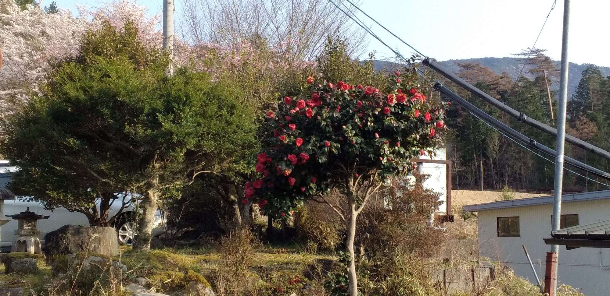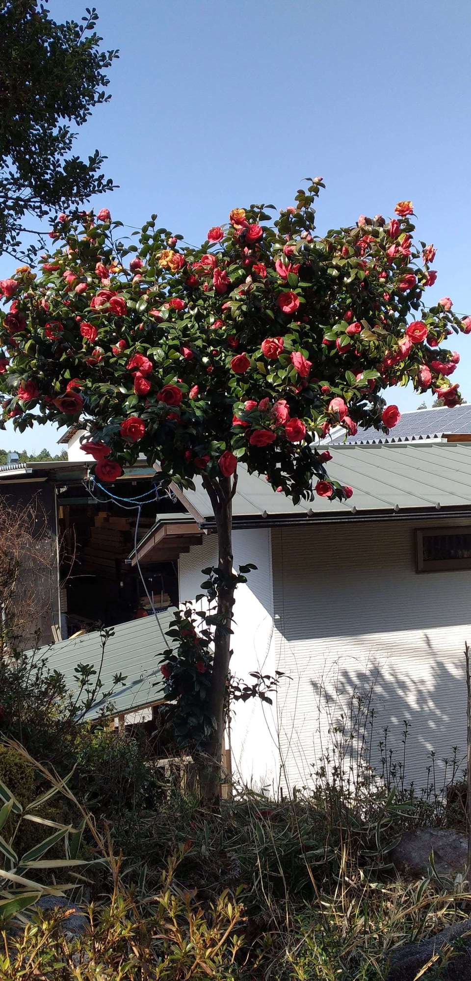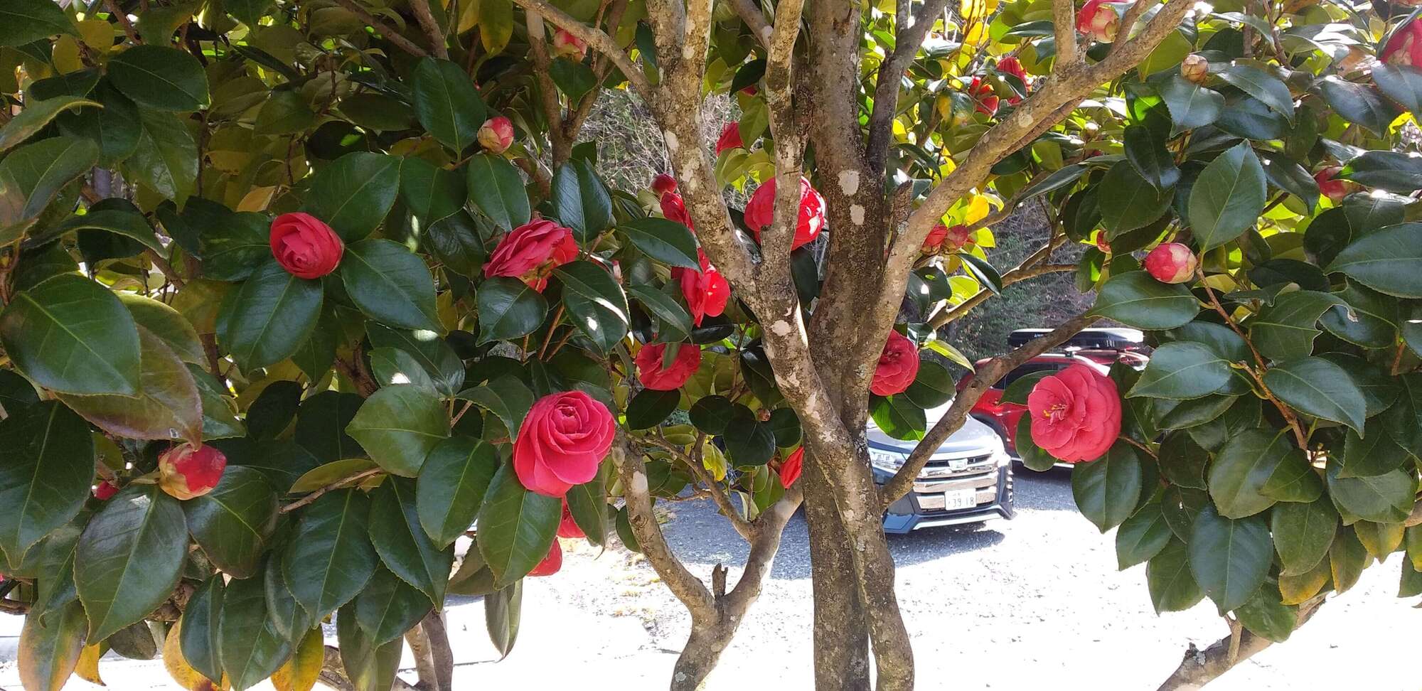 私の駐車場横の山茶花(サザンカ)の赤も目を引きます。