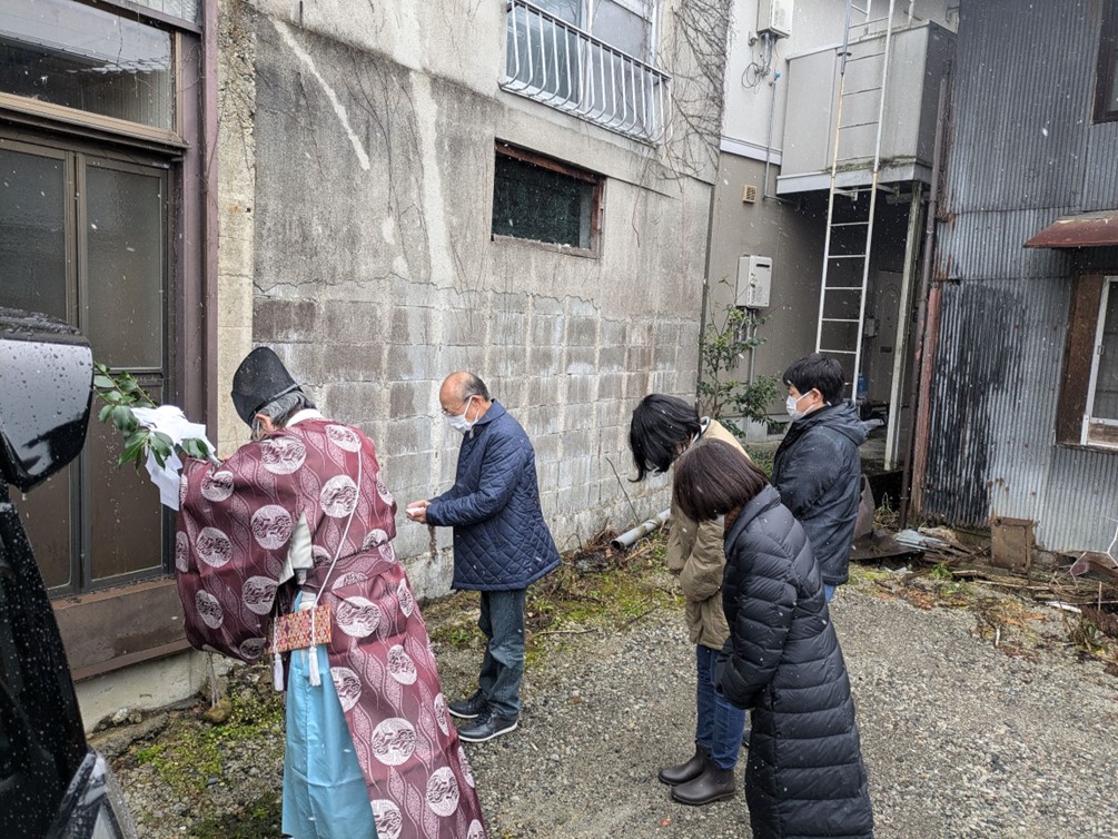 建物の神様に工事の報告し、敷地を清め、水上様に報告し、感謝し、この建物を鎮めて貰い、