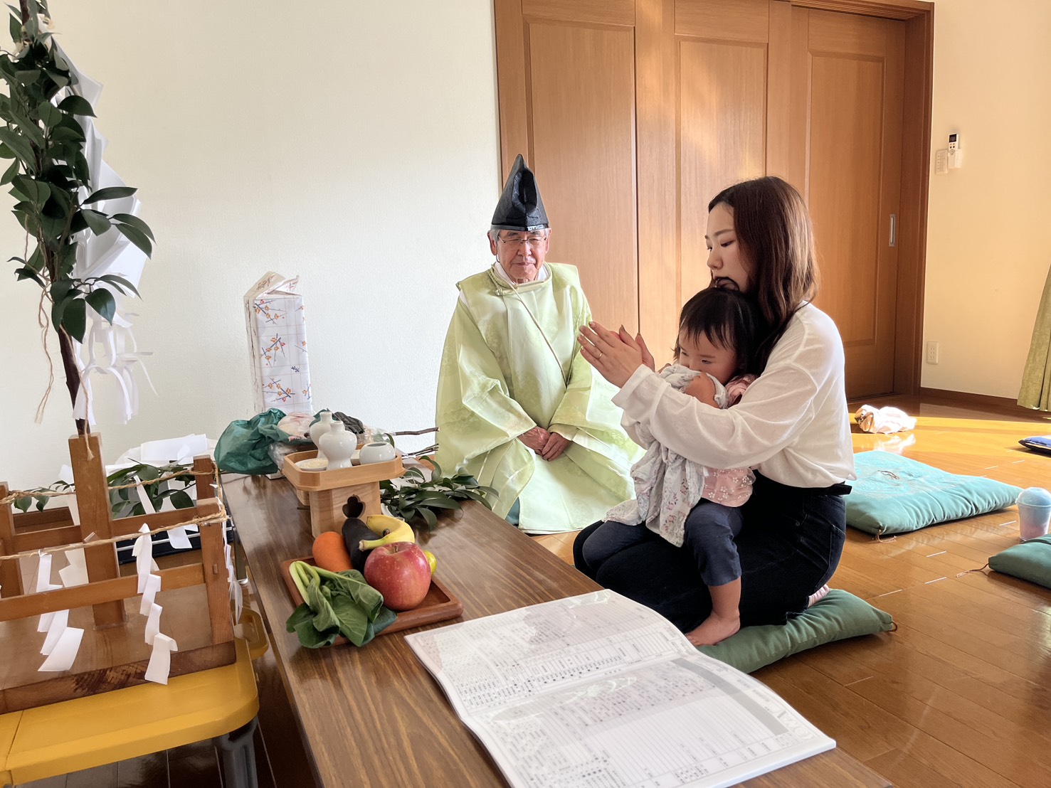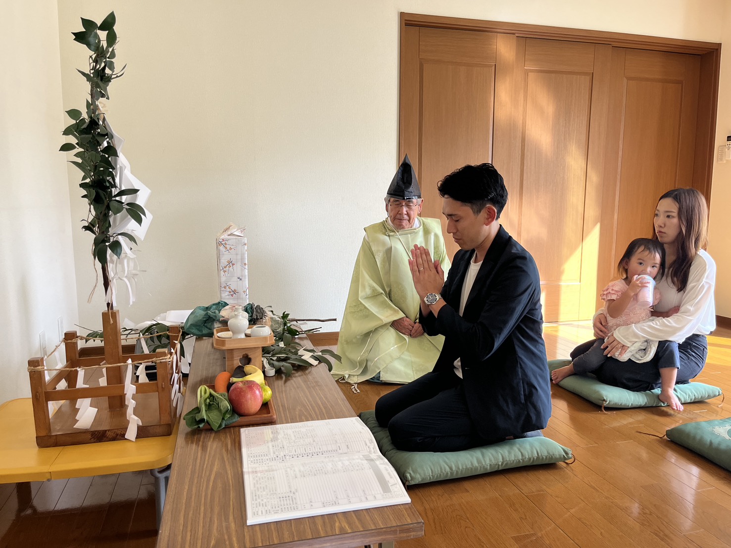 地元の氏神様、恵那神社宮司の祝詞がひびき渡り、その土地の神様に報告し、敷地を清め、神様に感謝し、土地の神様を鎮めて貰い、完成までの無事故と住まいする家族の繁栄を祈願して頂きました。