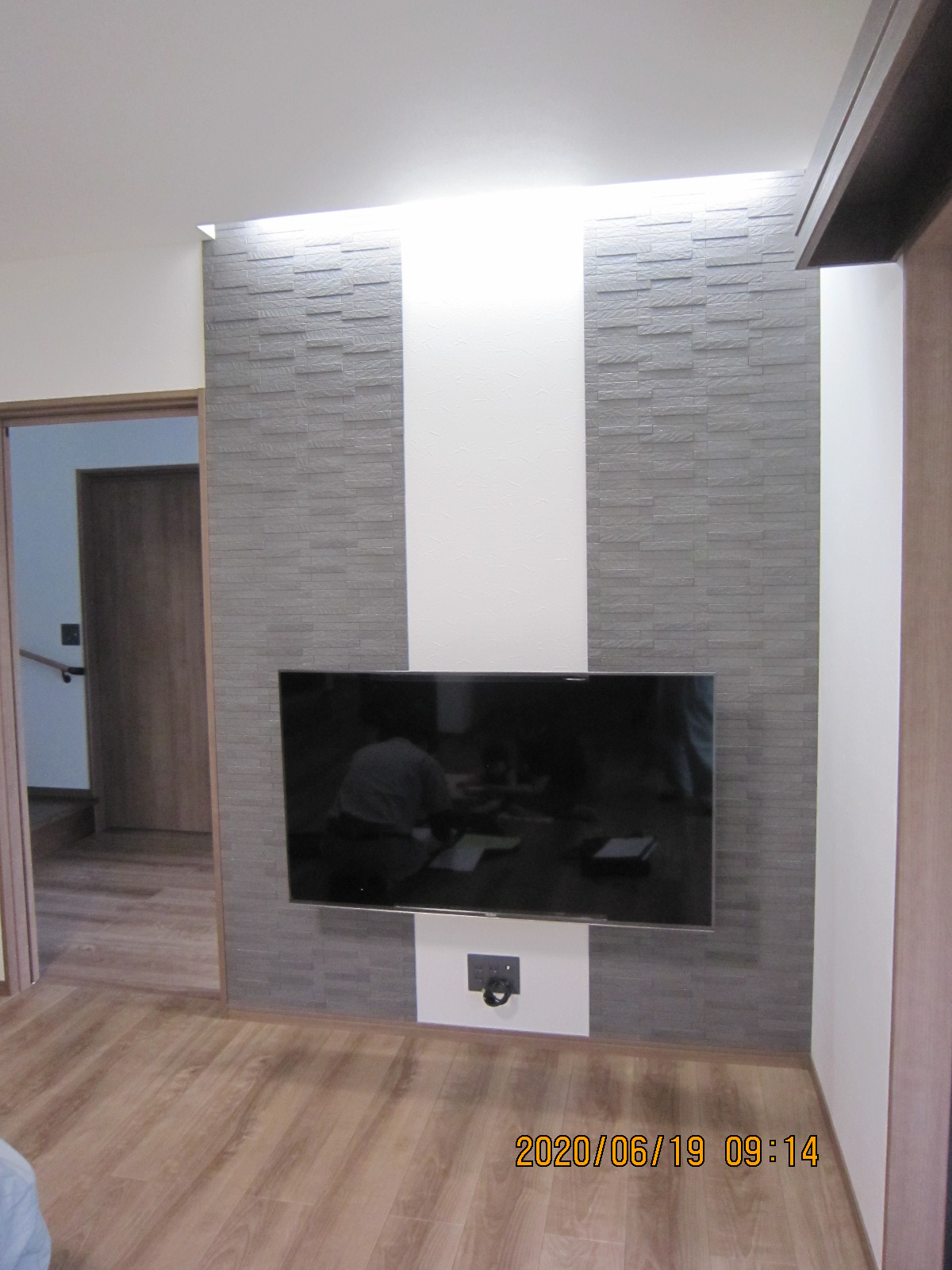 (TV台はH様自ら作成されました。外観で出てくるウッドデッキもH様施工です。社員も職人さんも本当にびっくりです!!)