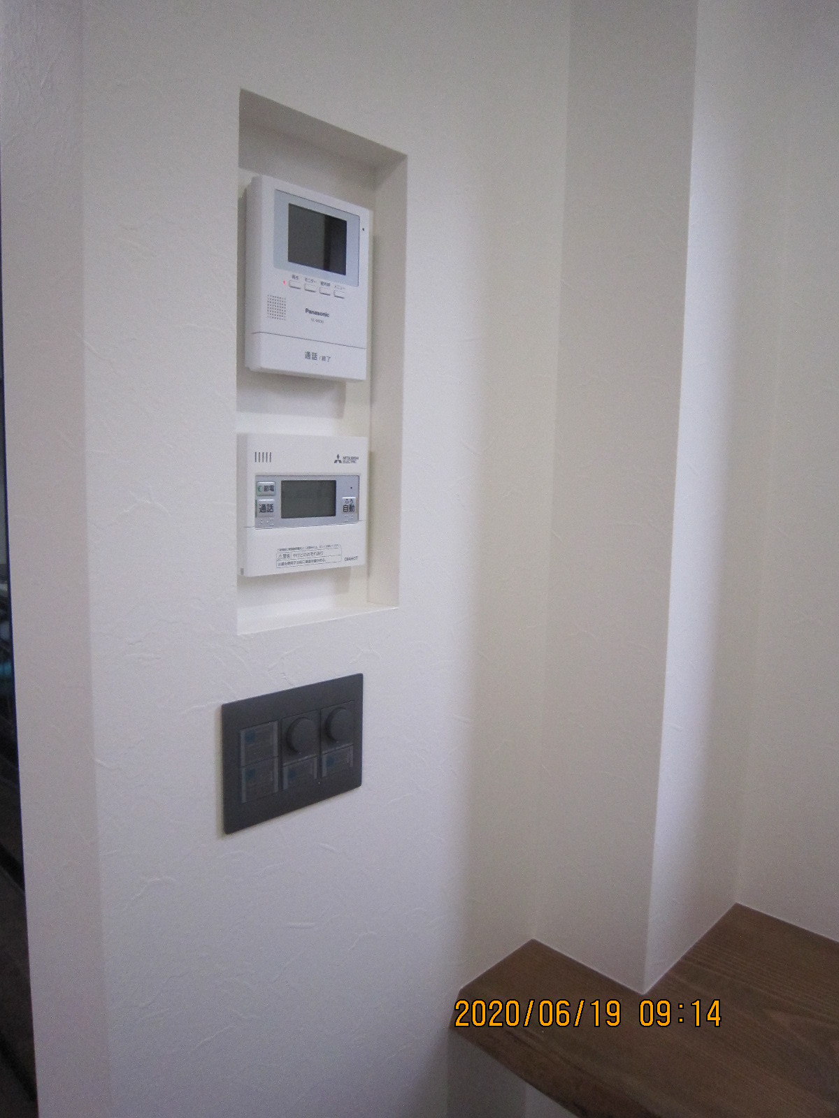 エコキュートのリモコンや水回りのスイッチ等がまとまった、ニッチが施工されております!