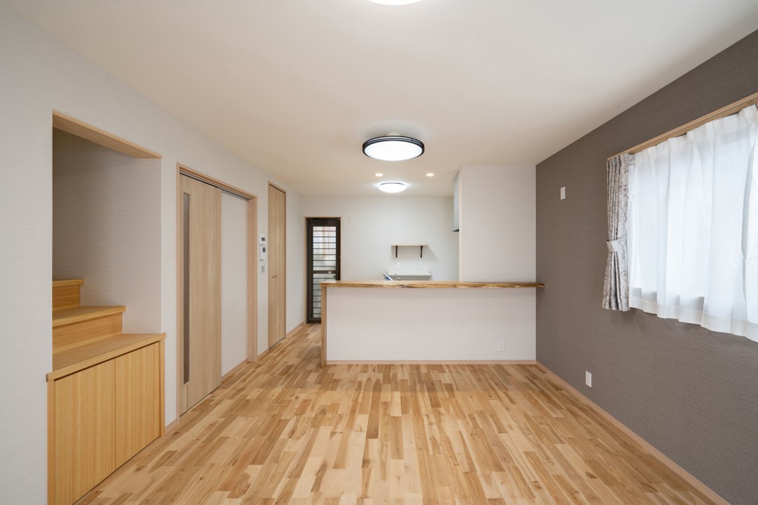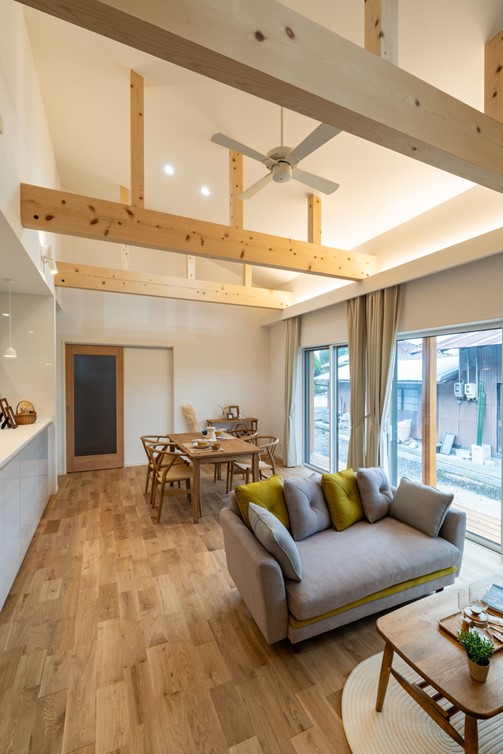 LDKは勾配天井、広々としたリビングに仕上がりました。