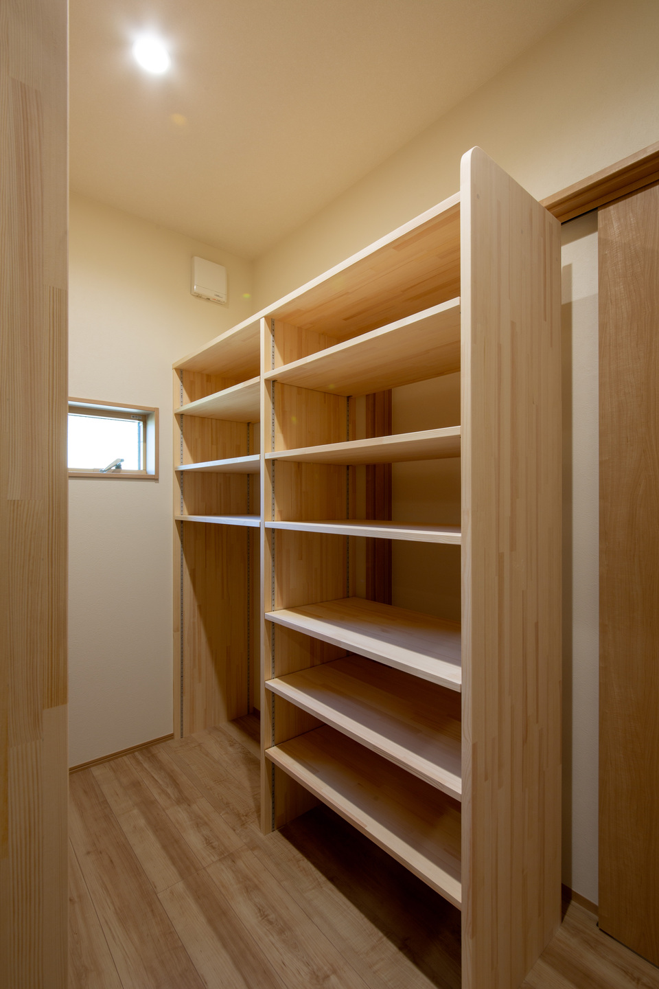 最近どのお客様もこだわっている家事同線ですが、A様邸はキッチンから、独立したパントリー、物干しスペース、脱衣室が直線に配置されているので、最短距離で家事をすることができます。