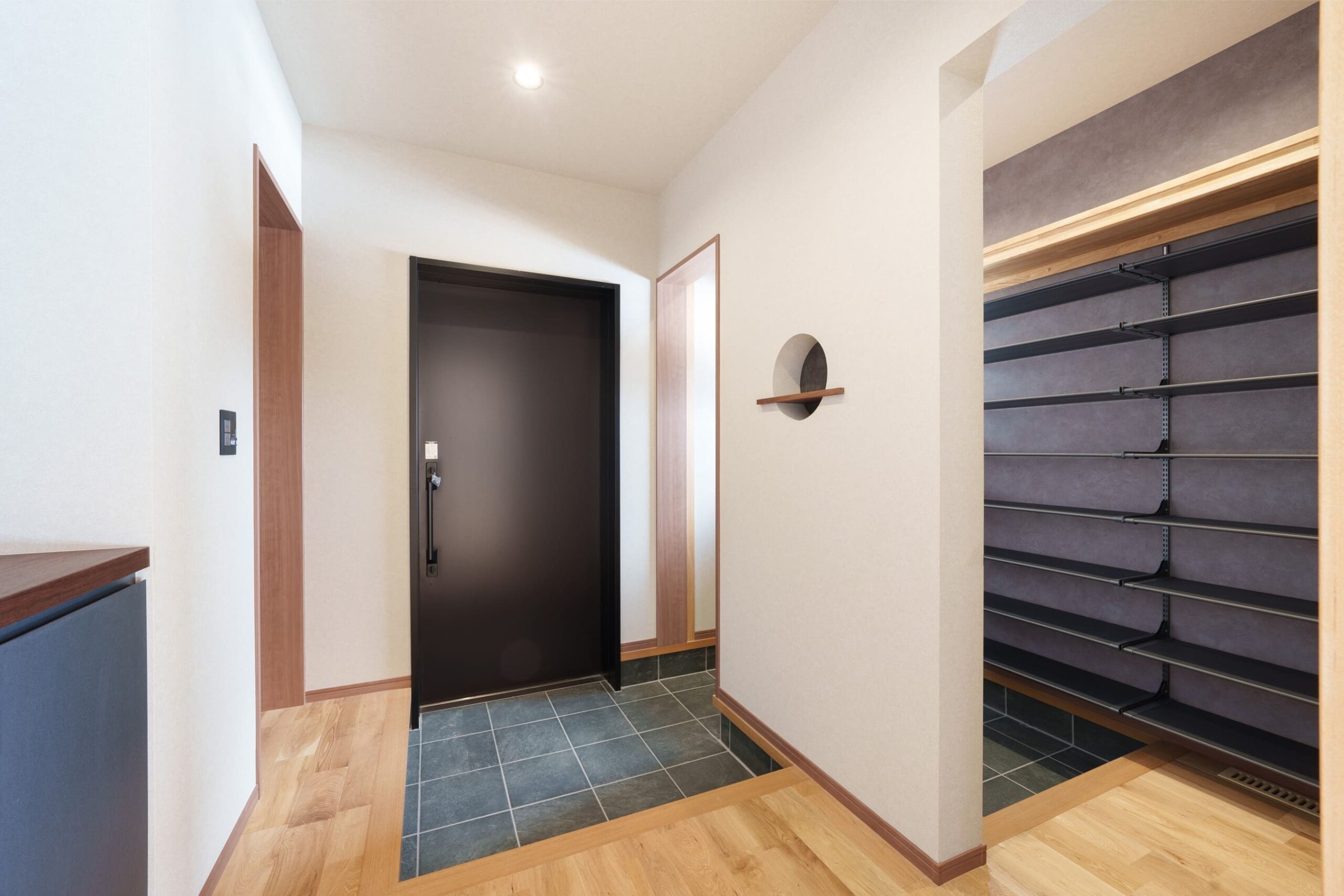 4. ベビーカー、傘掛け、50足以上の靴を収納でき、さらに通り抜けできる「ファミリー玄関」
