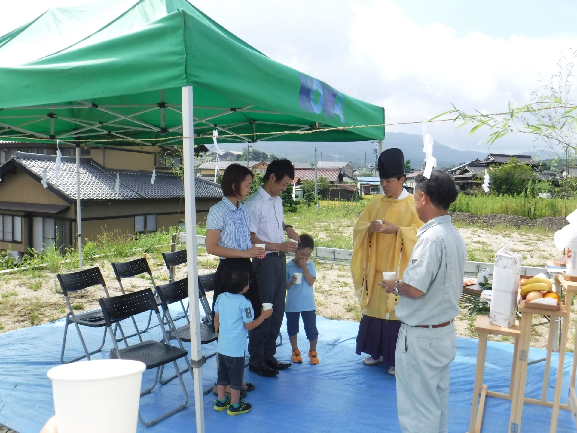 ご縁を頂きました、坂本諏訪神社宮司の祝詞がひびき渡り、その土地の神様に報告し、敷地を清め、神様に感謝し、土地の神様を鎮めて貰い、完成までの無事故と住まいする家族の繁栄を祈願して頂きました。