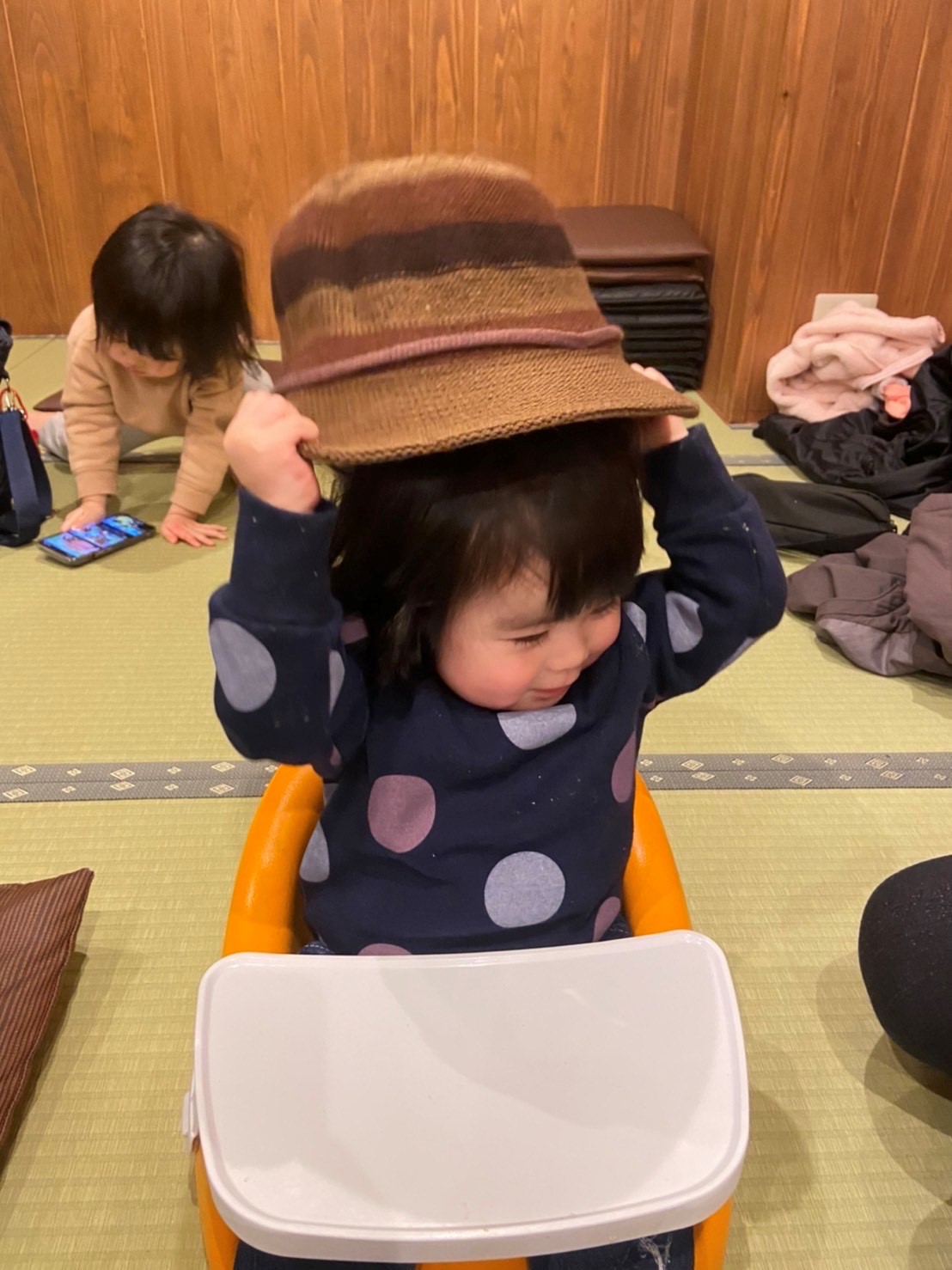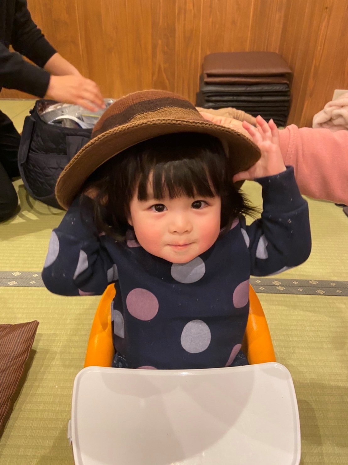 母の帽子を娘に被せて遊んでいました。最初は帽子を被せると嫌がって取ろうとしますが、