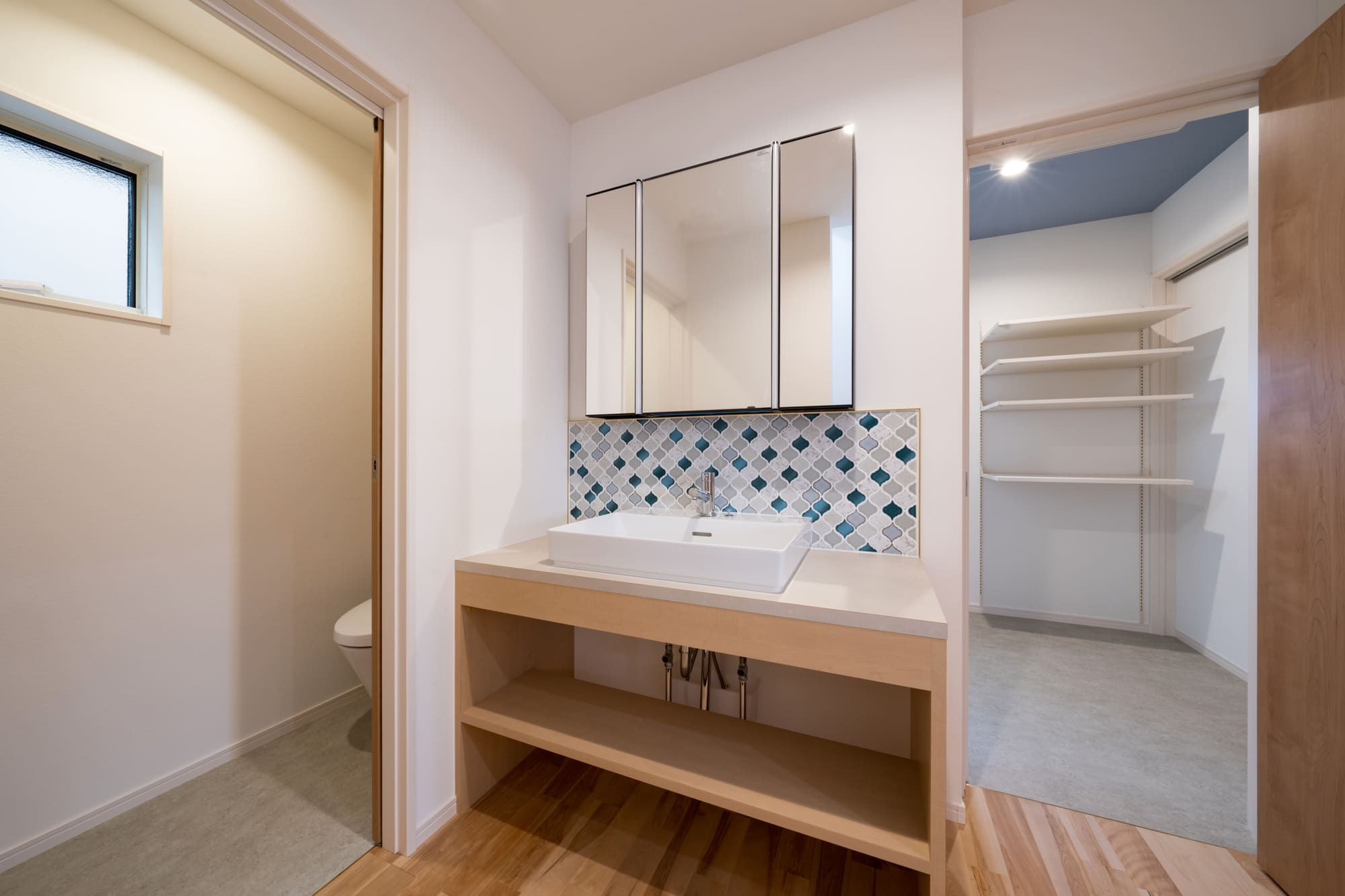 奥様こだわりの洗面化粧台は、メラミンカウンターを使用した作製仕様になっています。