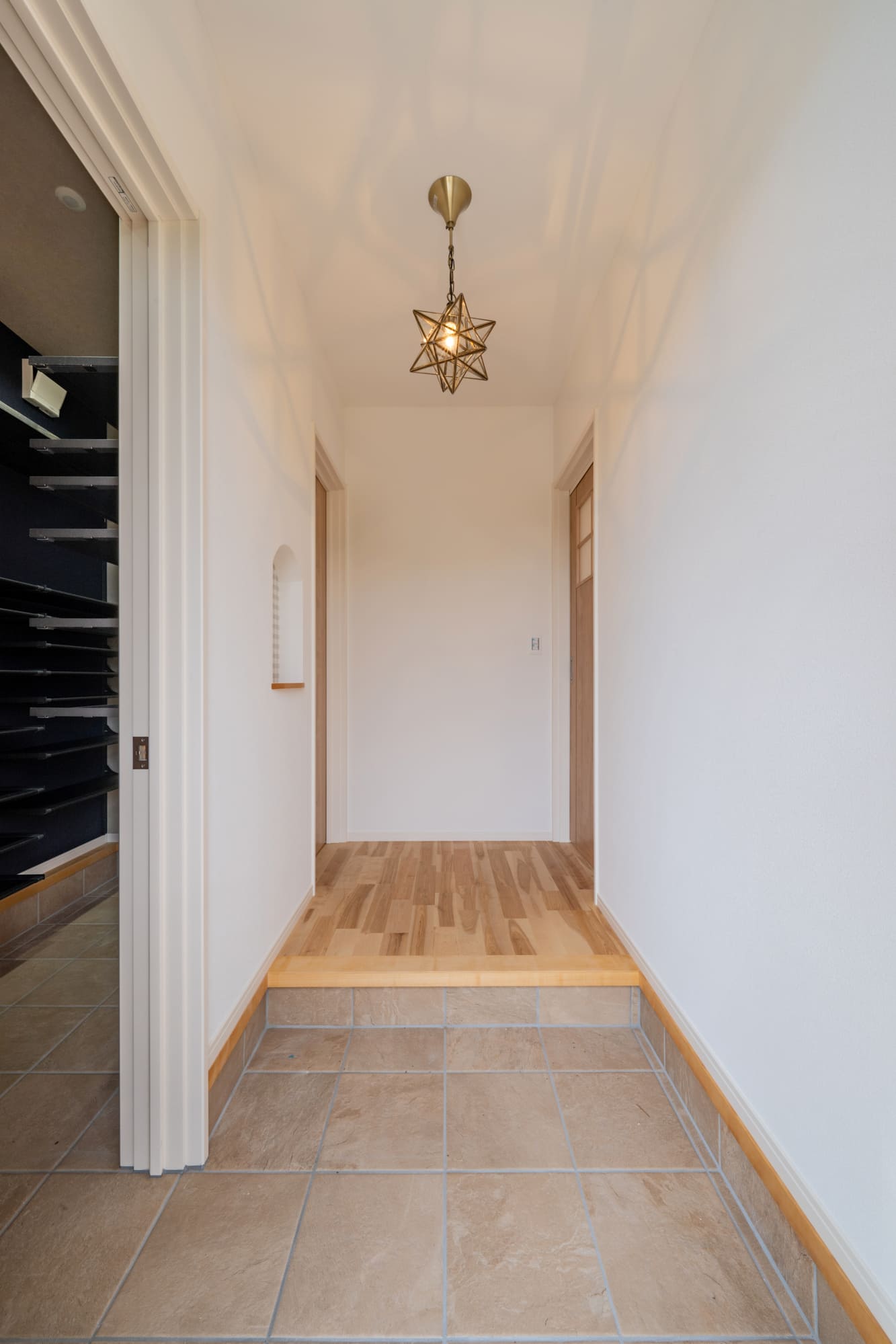 玄関ドアを開けると、可愛い星型の照明器具と、チェック柄のニッチがあります。
