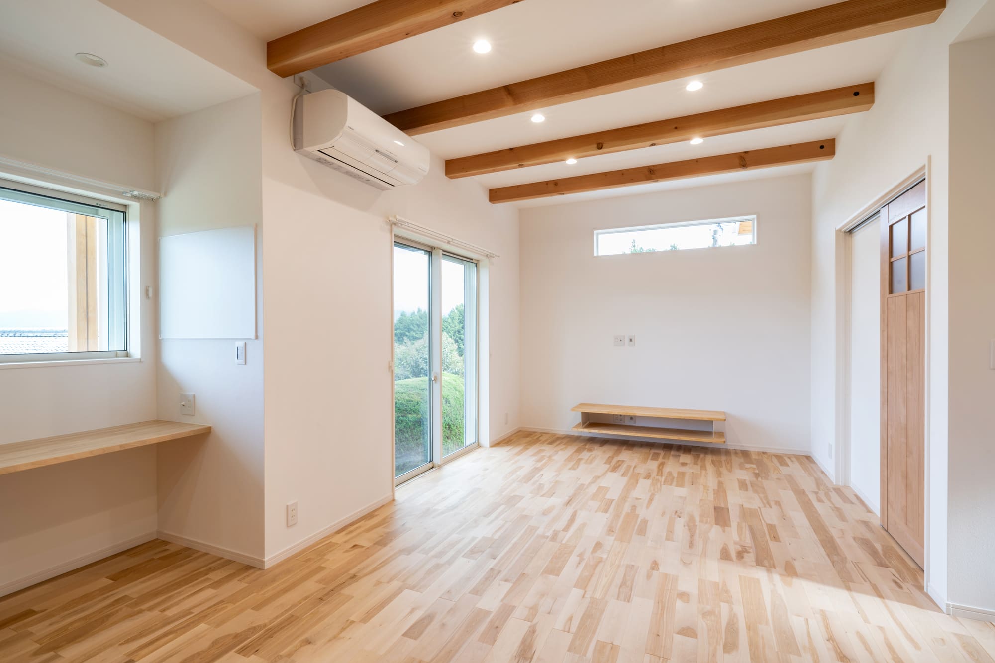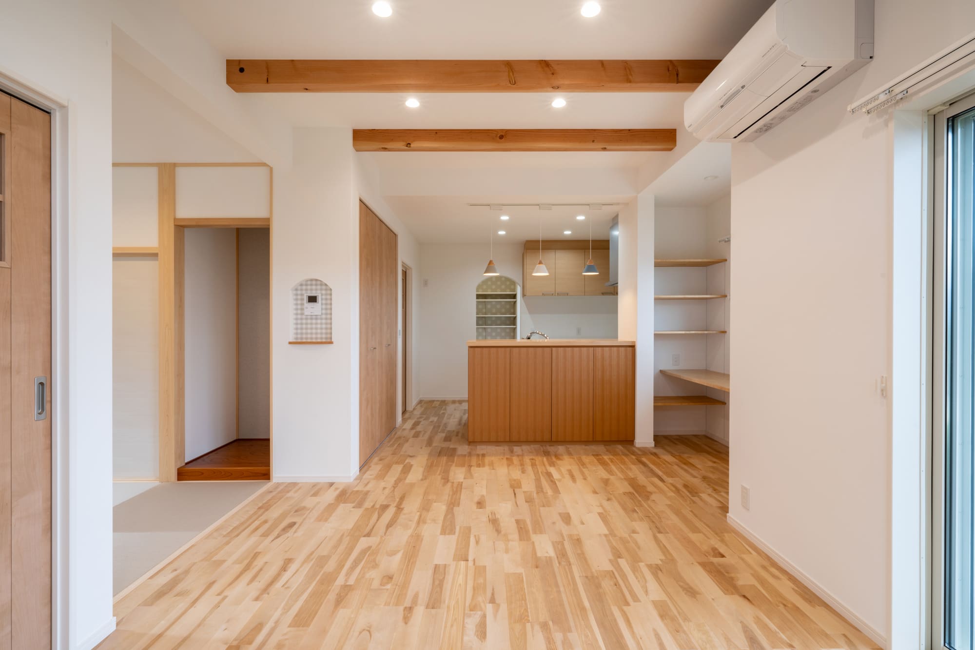 LDKは、構造材の梁天井に表し、床材はバーチを使用したナチュラルな北欧仕上げとなっています。