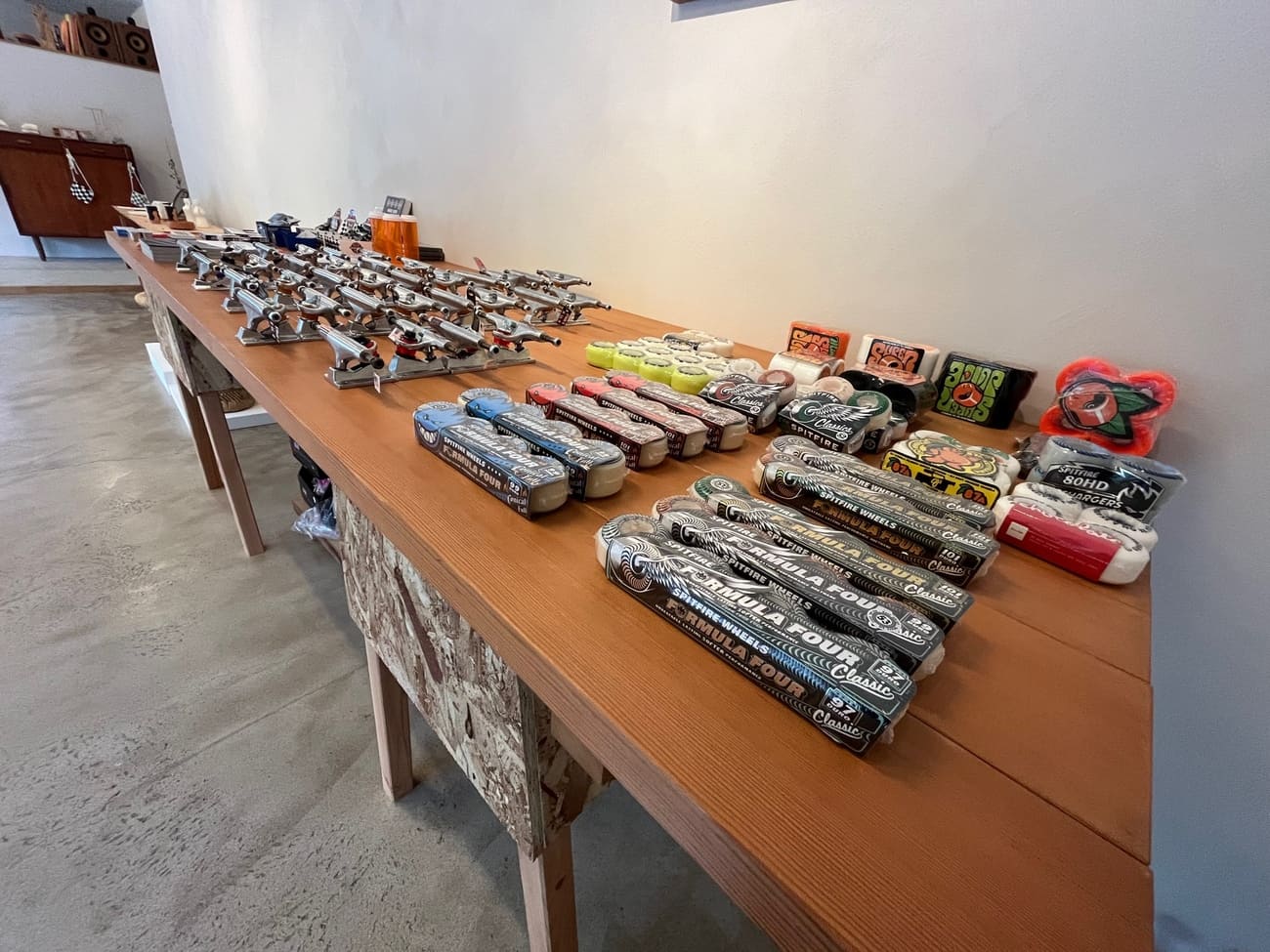お店では、スケートボードのデッキ(板)や、ウィール(タイヤ)など自分好みに組み合わせて購入ができます。