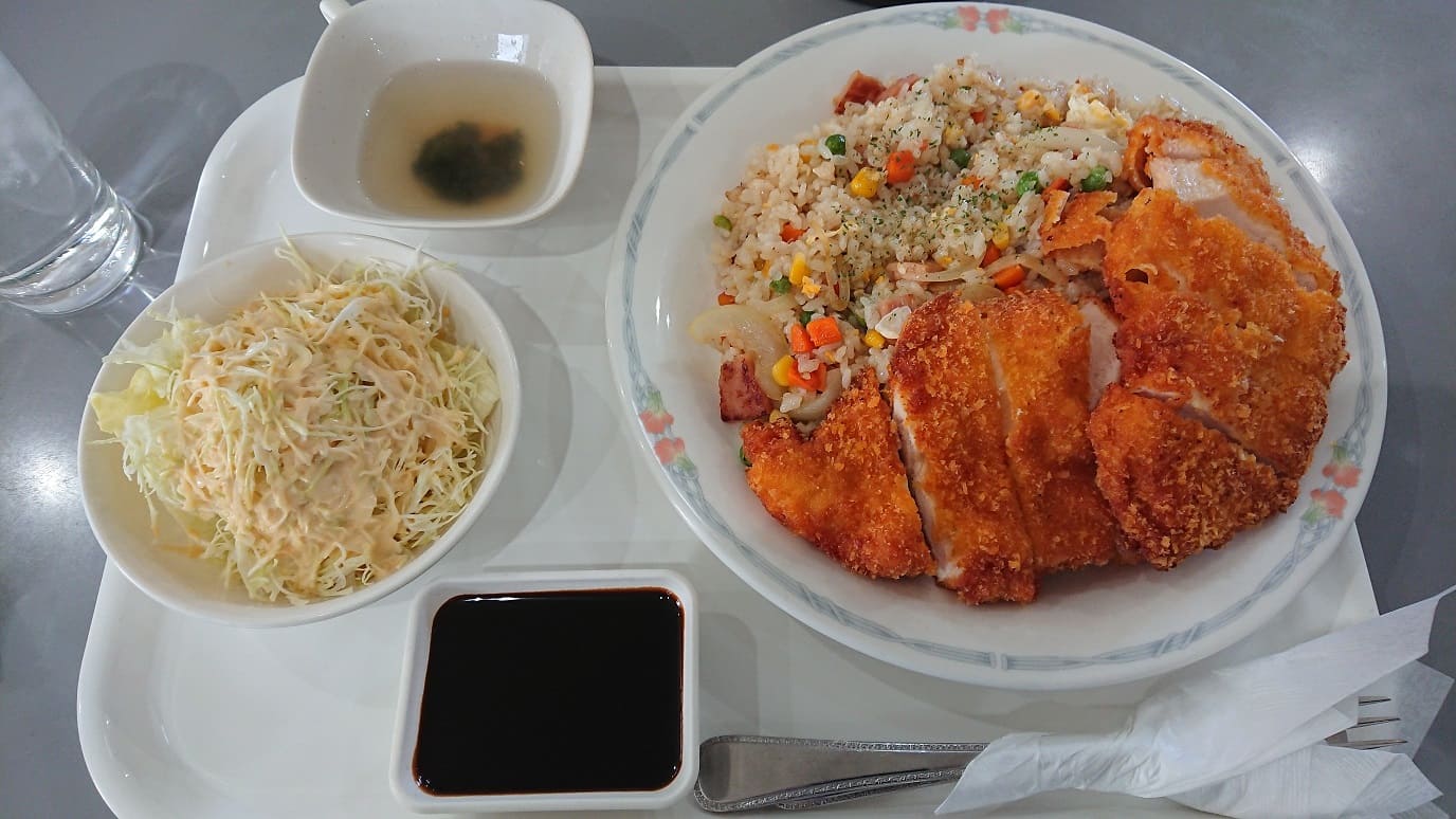 - ピラフとチキンカツの組み合わせは口の中が油分のお祭りになります。