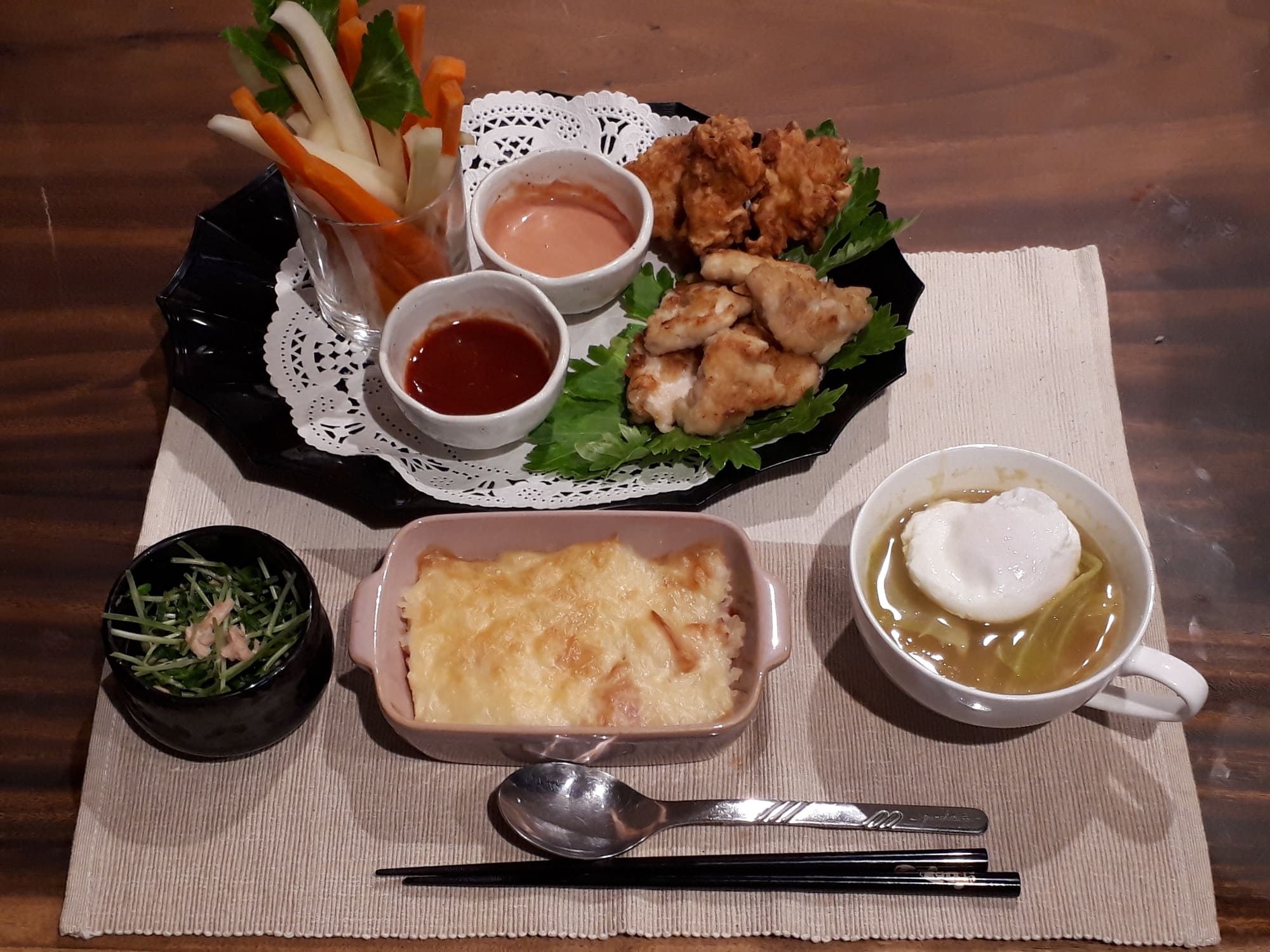 ドリア、カレースープ、チキンナゲット、豆苗サラダでした。