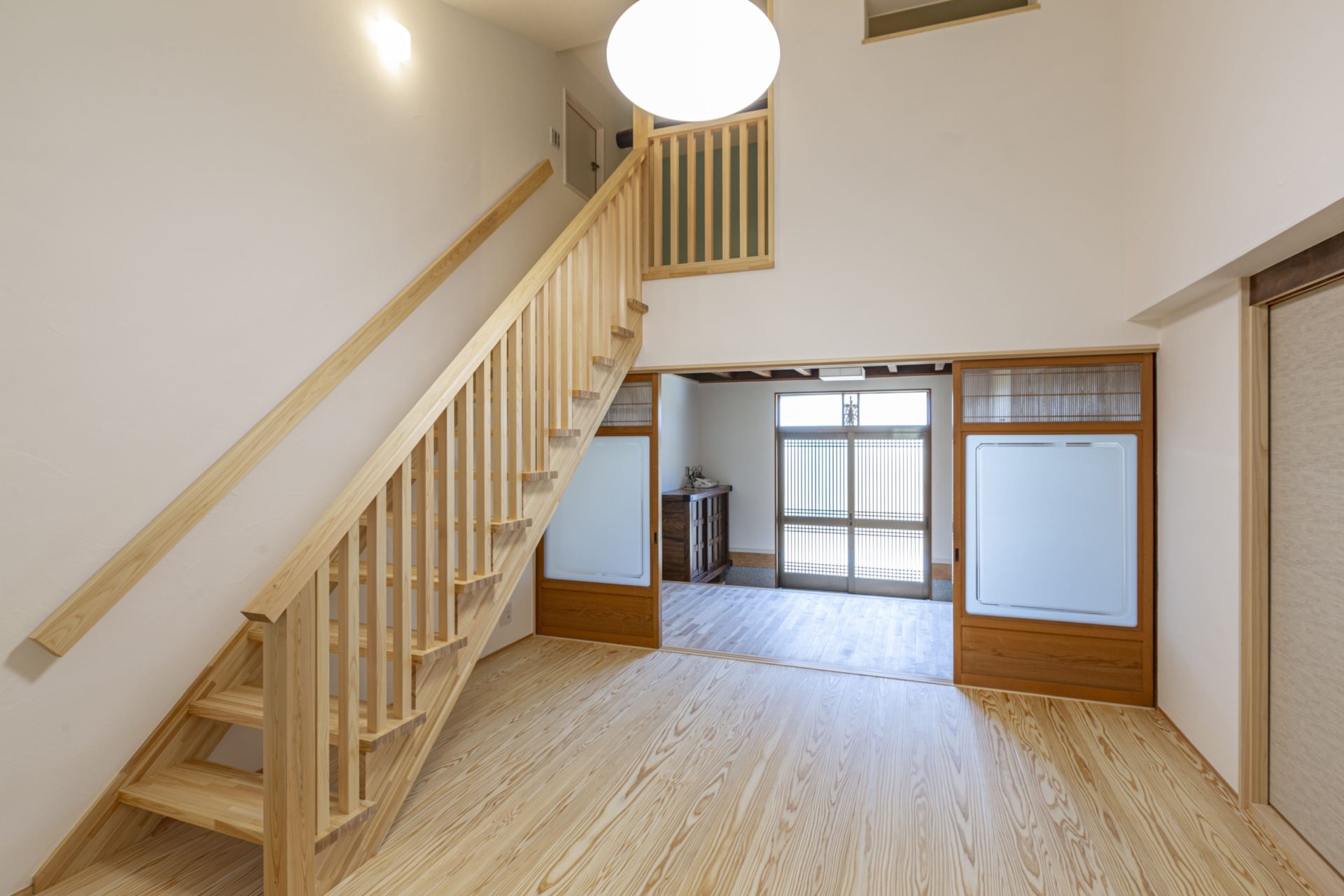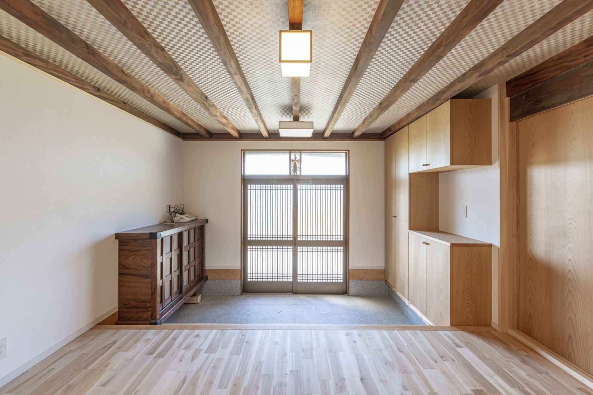 玄関は、年数を重ねて色づいた柱や梁を再利用した、和の雰囲気になっています。