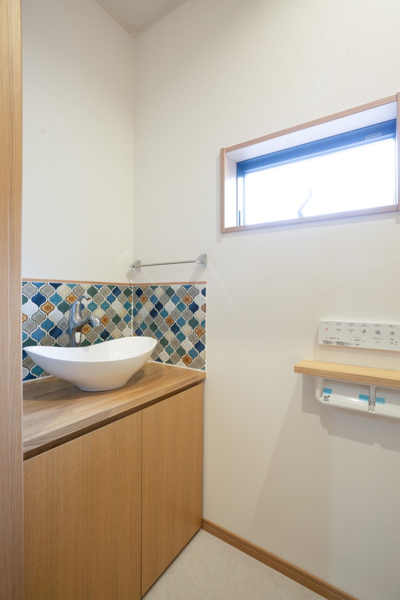 おまめ形の手洗い器と可愛いタイルで素敵なトイレになりました。