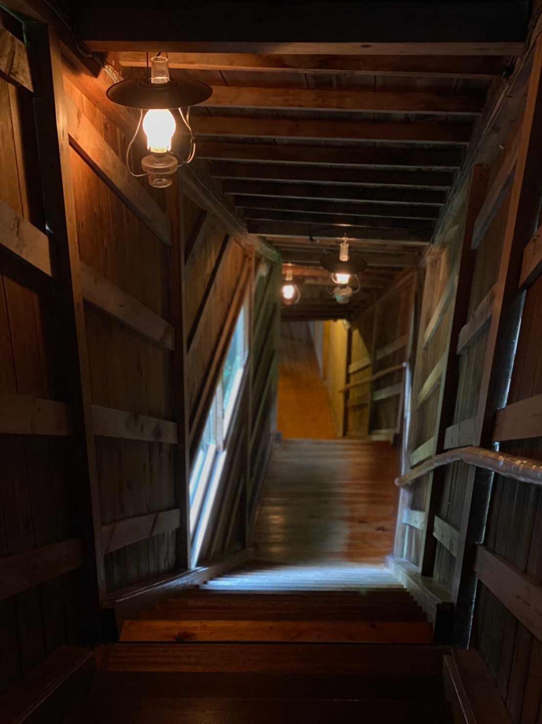ロビーから客間に行く際、なが~い木製の階段を下っていきます。