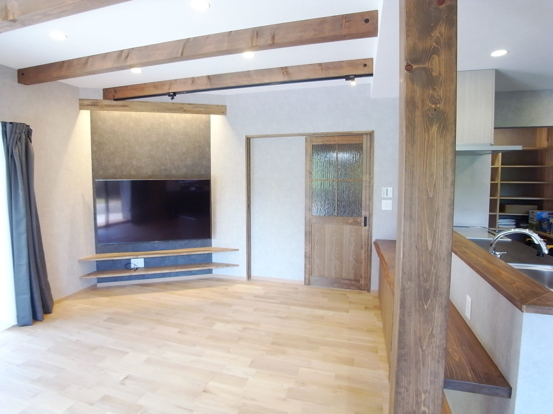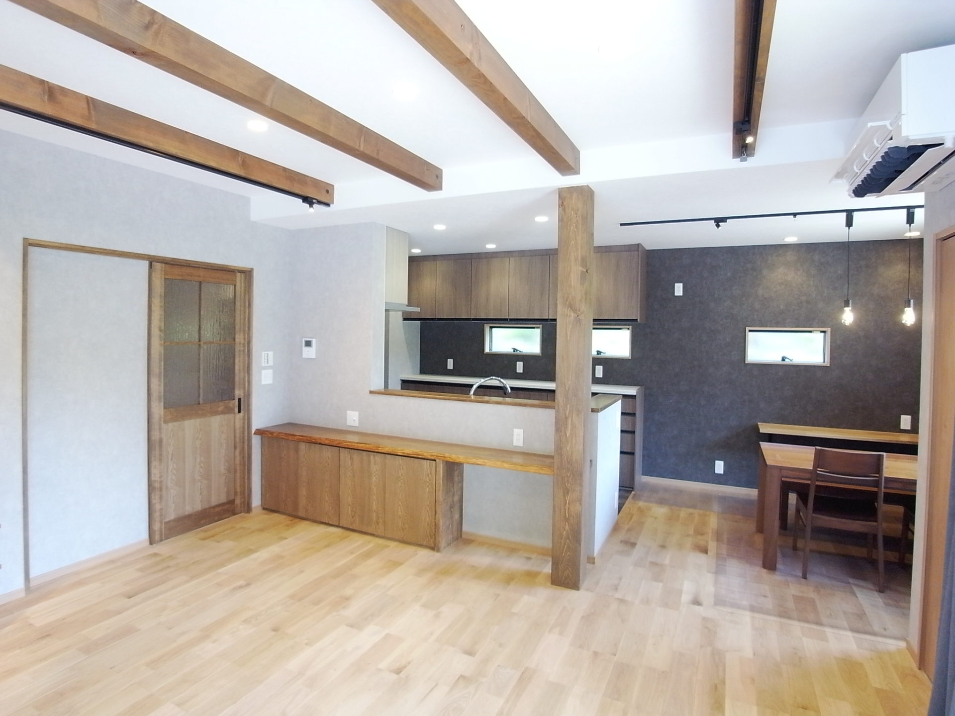 内観は大黒柱・化粧桁・作製建具・作製収納・無垢のフローリング材など化粧の無垢を使用しました。