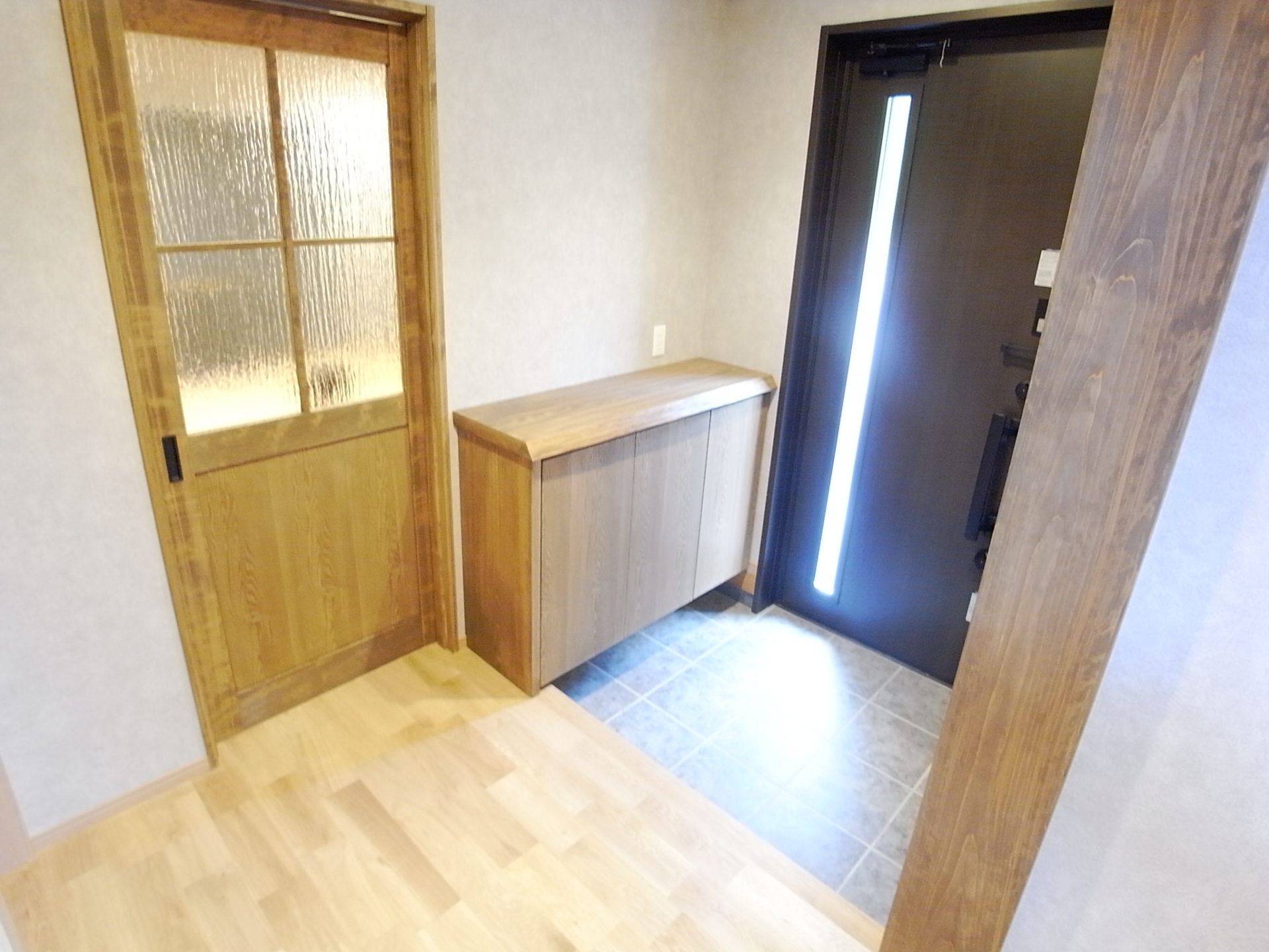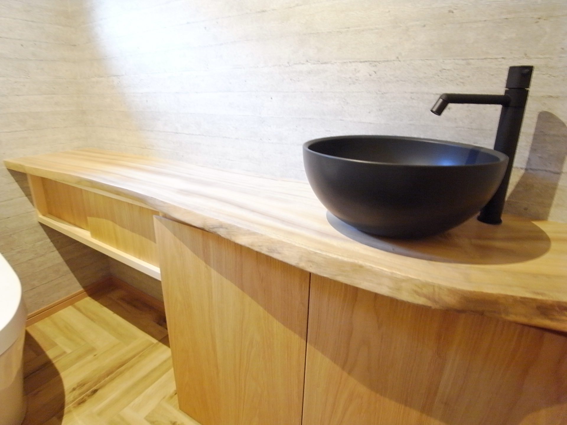 もちろん玄関下駄箱・キッチン前カウンター・トイレ収納の無垢天板は