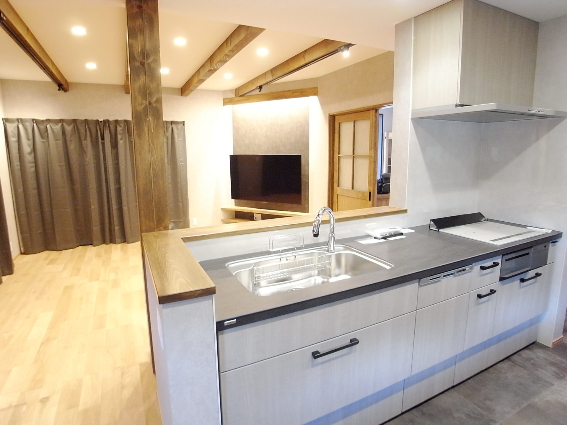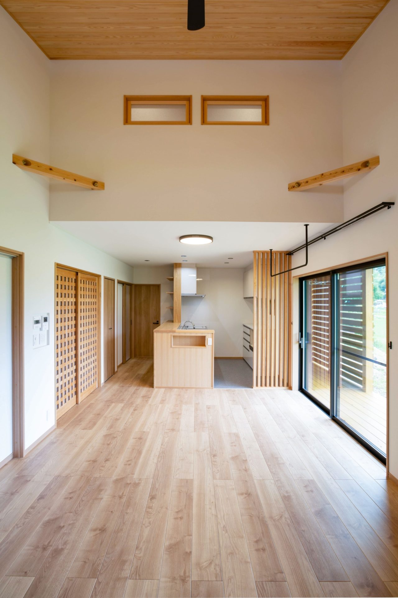 大空間のLDKは板張りの勾配天井。