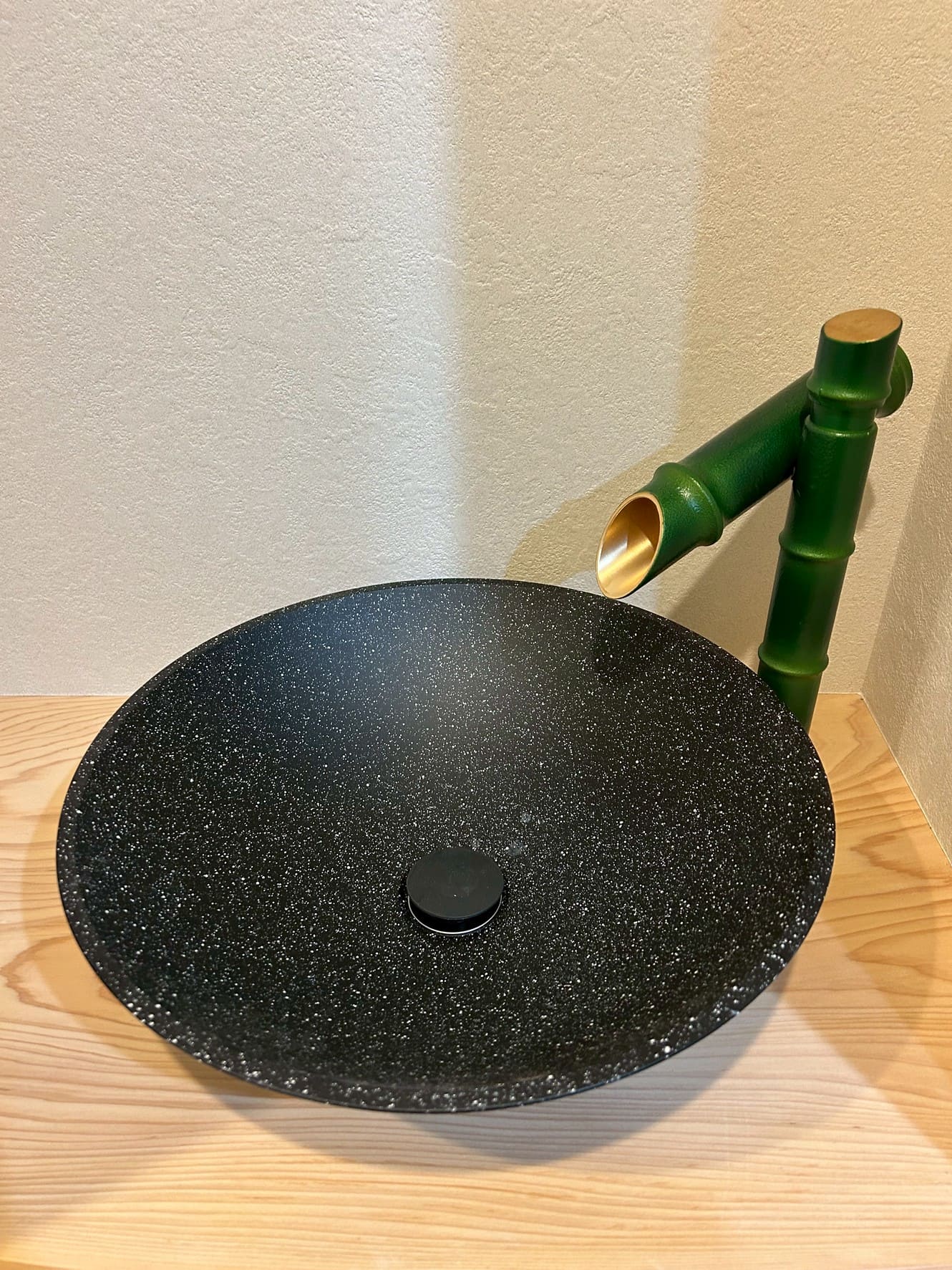 無垢のカウンターに黒の丸型手洗い器と竹の水栓がすごくマッチして高級感が出でますね。