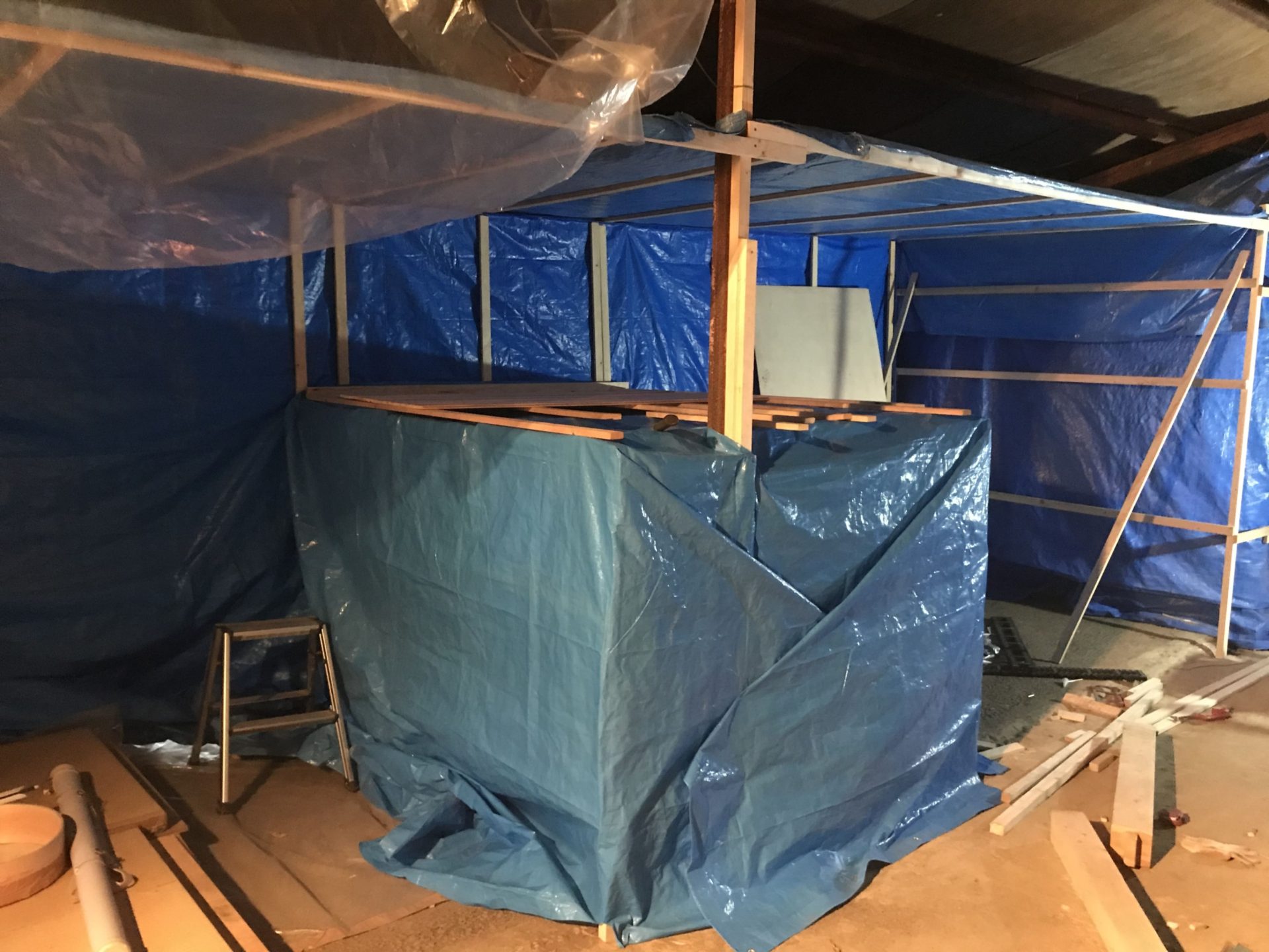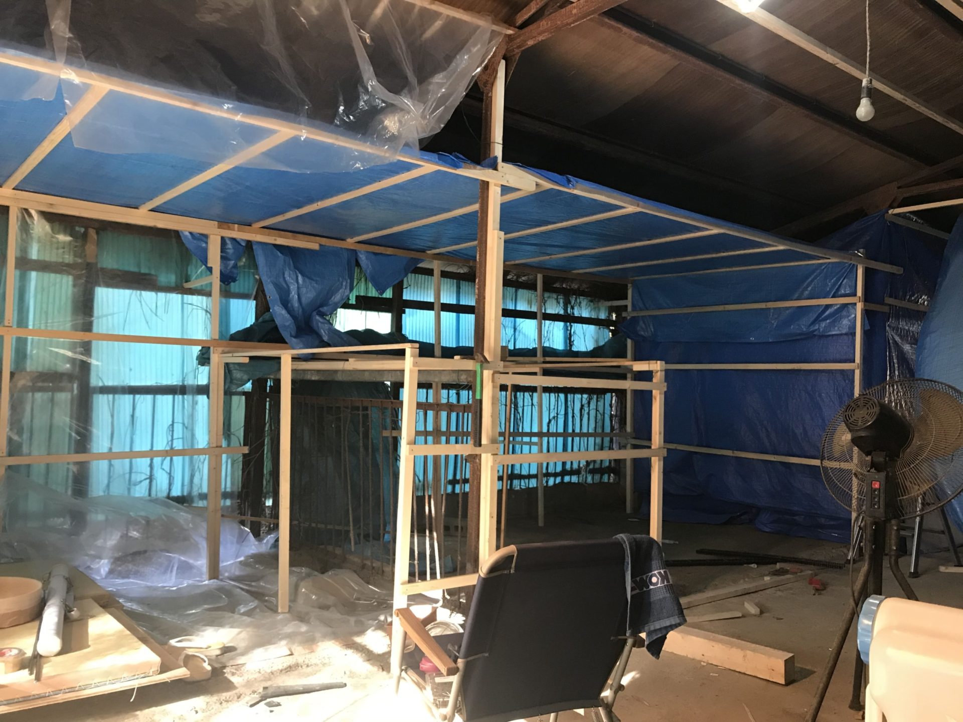 その後、隙間風をおさえるために、その辺にあったブルーシートを張りました!