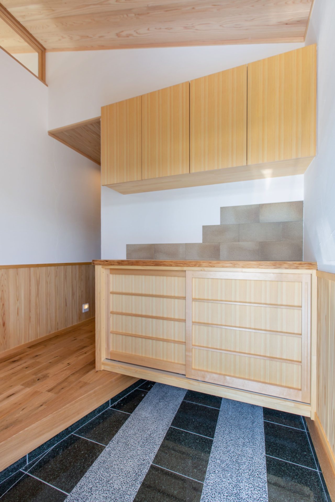 幕板を少し上の位置に設置することで、2階の外壁が主張しすぎないようにしています。