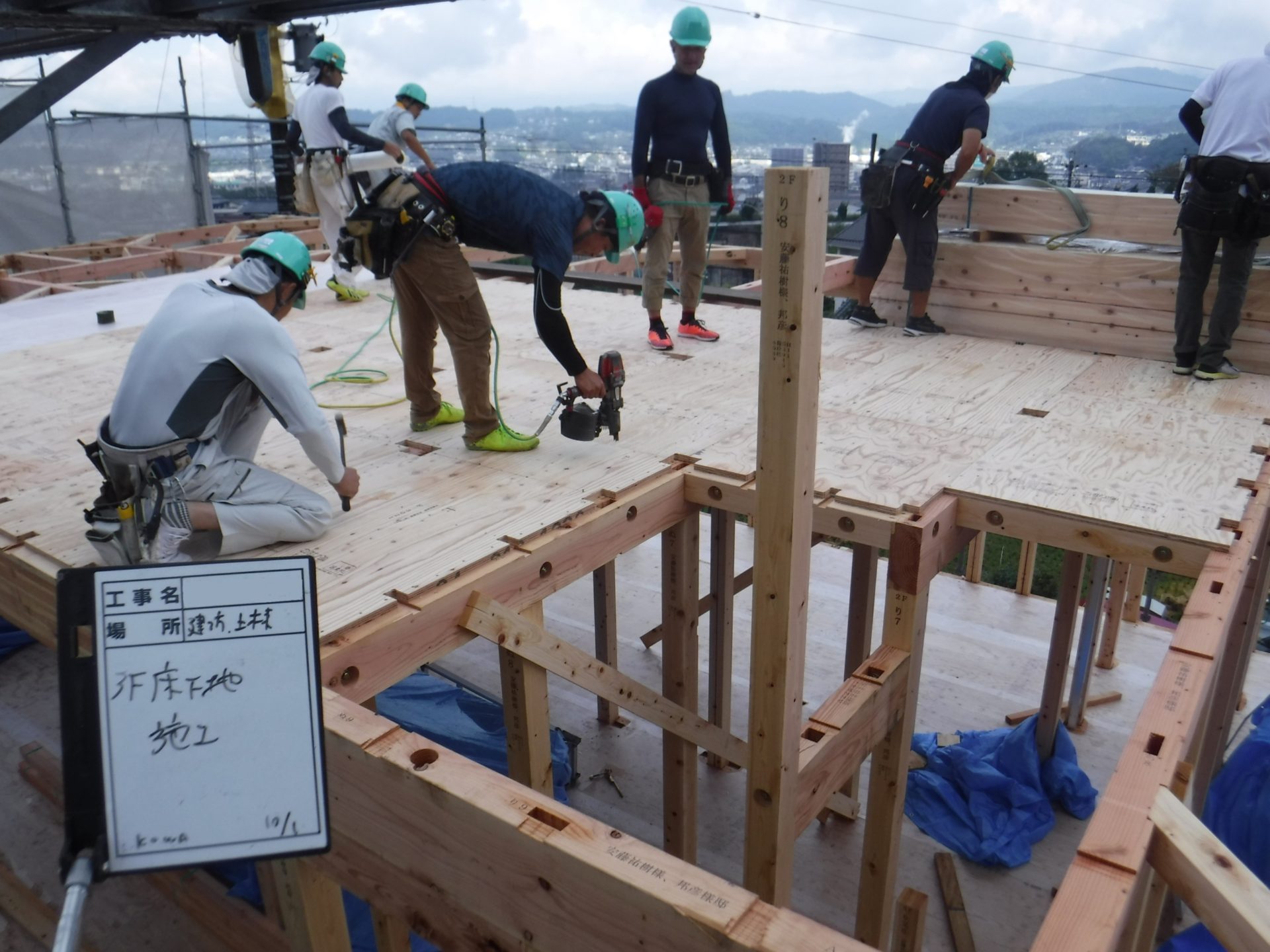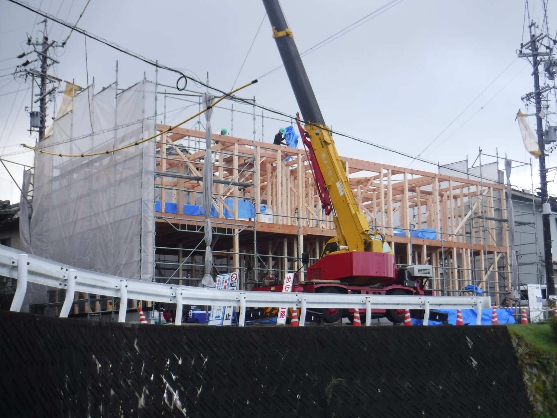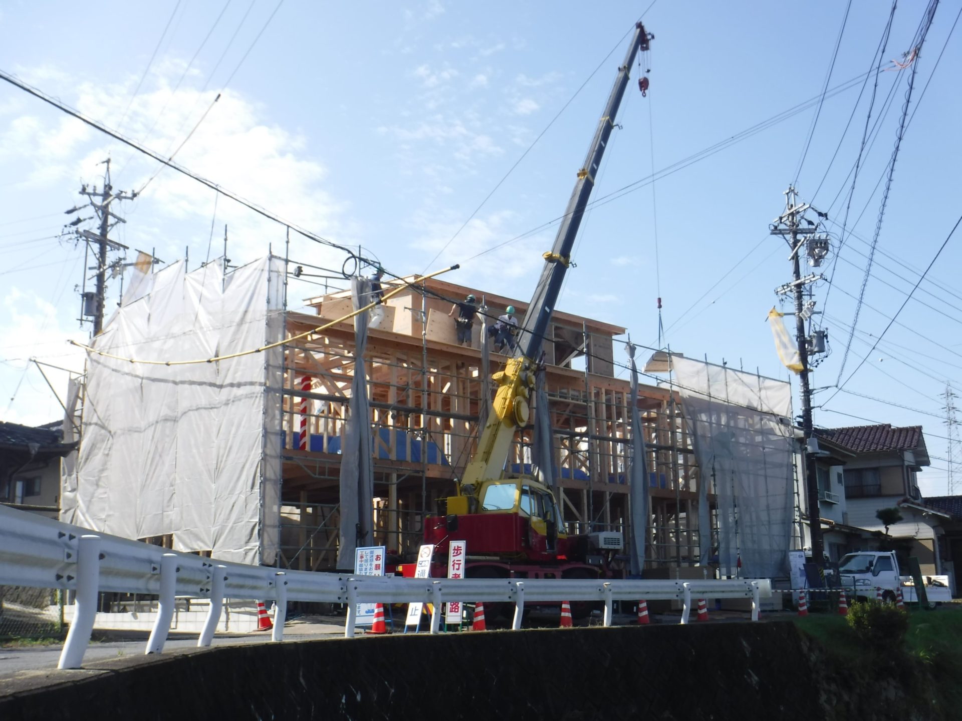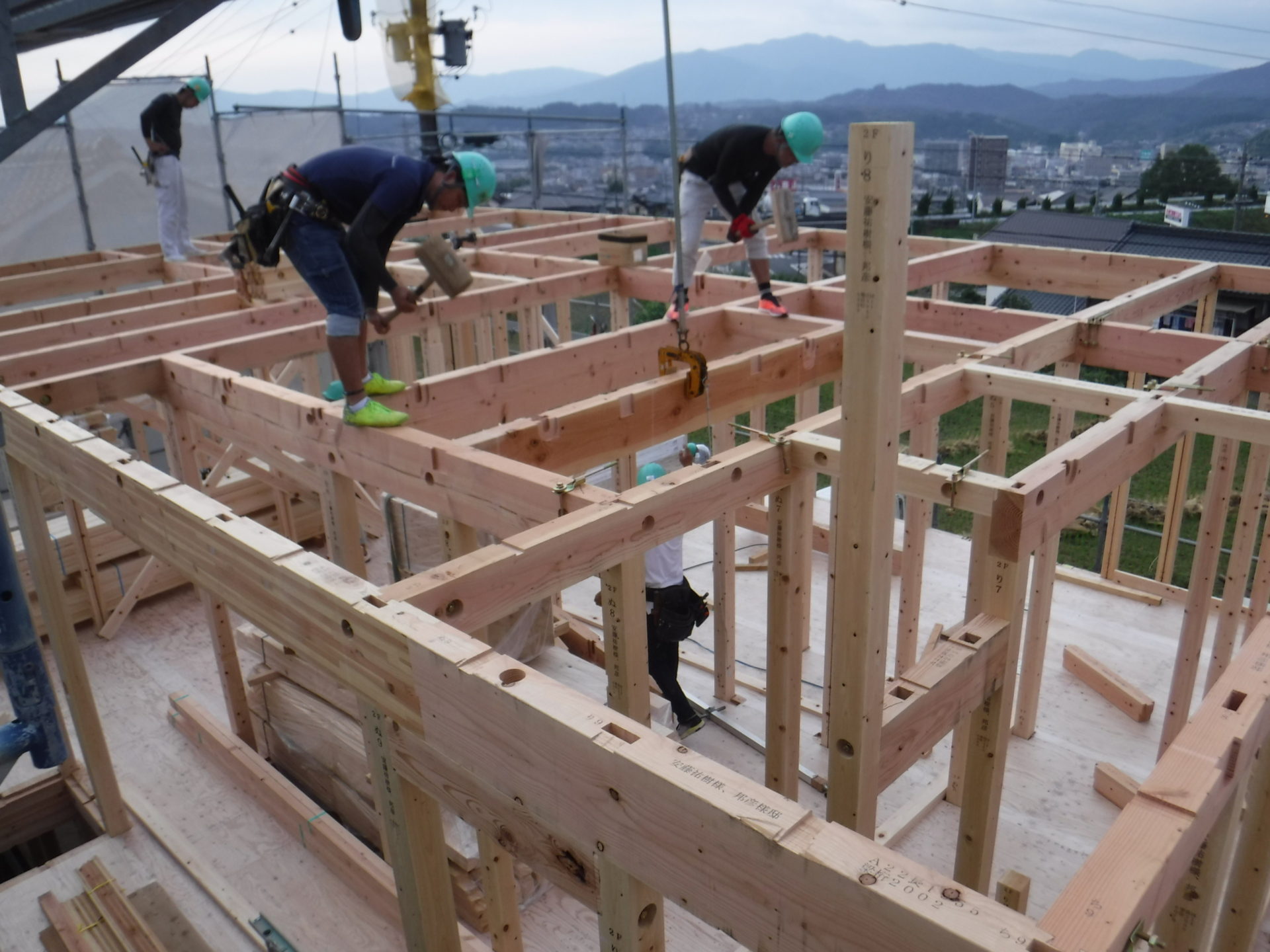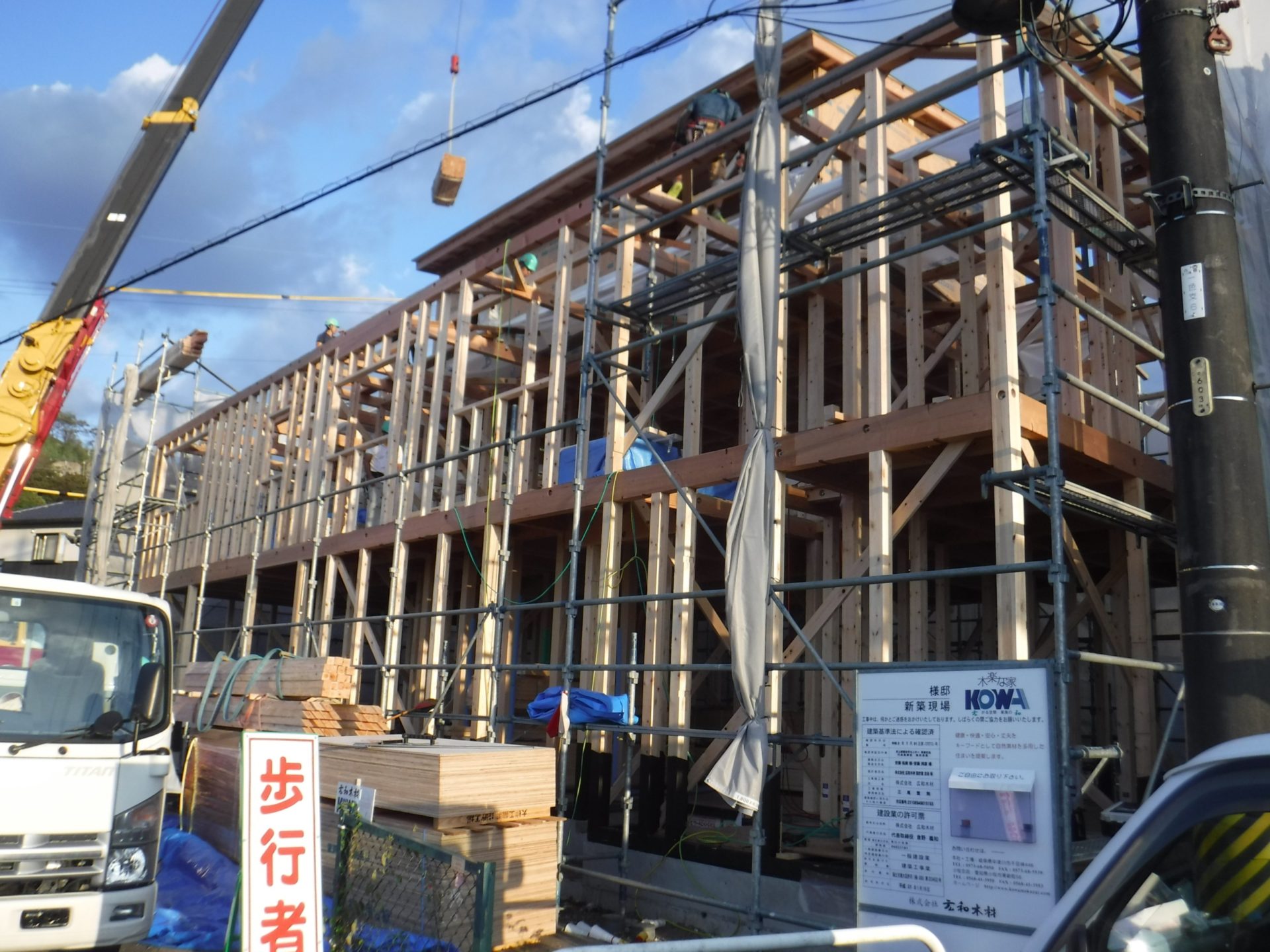 3階建ての2世帯住宅で、建物の規模が大きいので、初日は2F桁組完了を目標に作業をしていただきました。