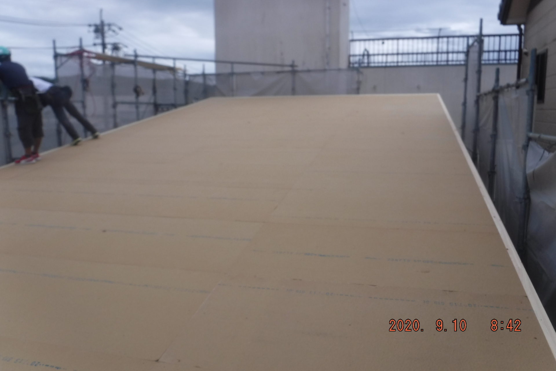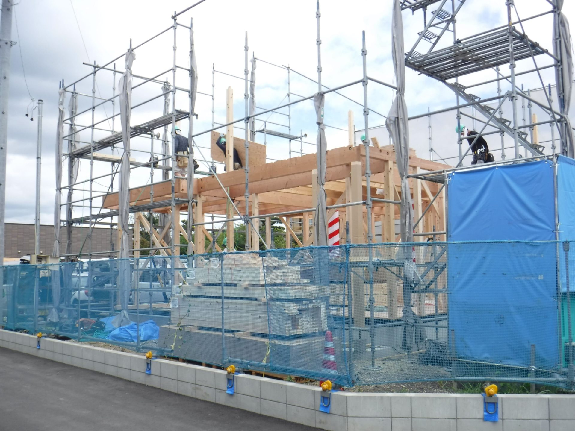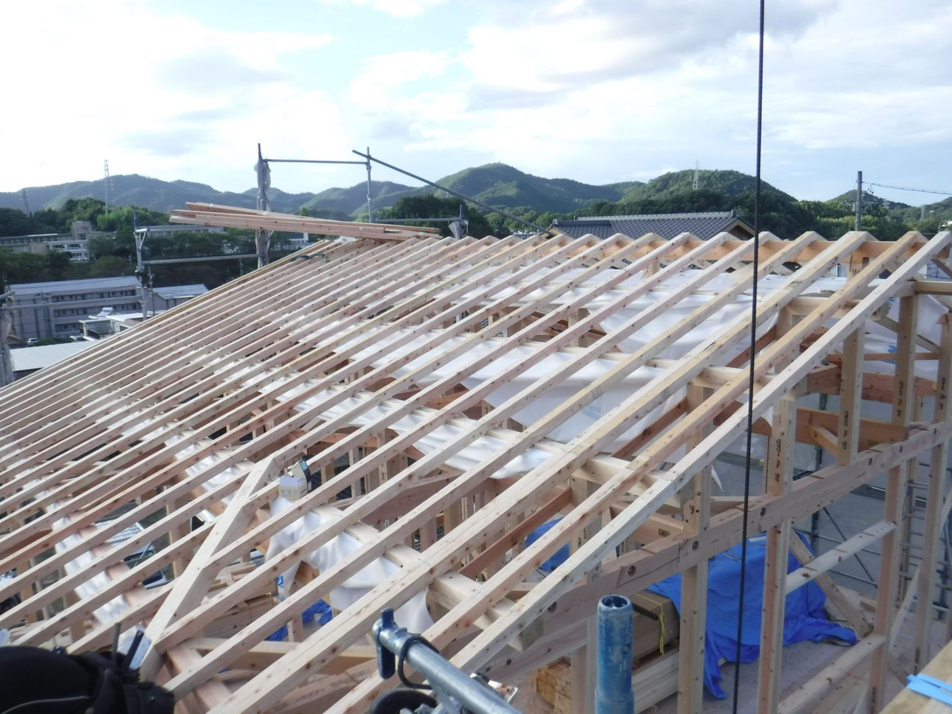 大屋根の下地まで出来て雨養生も完璧!
